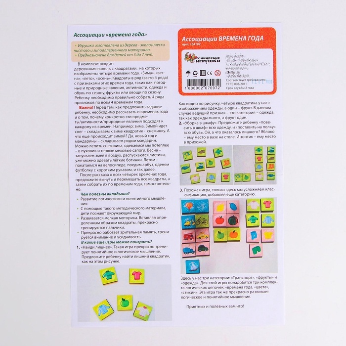 Игра «Логические цепочки. Времена года» изготовлена из дерева – экологически чистого и гипоаллергенного материала. В комплект входит: * Деревянная панель с квадратами, на которых изображены четыре вре... Показать описаниемени года. «Зима», «весна», «лето», «осень». * Квадраты в ряд (всего 4 ряда) с признаками этих времен года, таких как: погодные и природные явления, активности , одежда и обувь по сезону, фрукты или овощи по сезону. Цель игры:ребёнку необходимо правильно собрать 4 ряда признаков по всем 4 временам года. Важно!Перед тем, как предложить задание ребёнку, необходимо рассказать о временах года и о том, почему конкретно эти предметы/активности/природные явления подходят к каждому из времен. Например: зима. Зимой идет снег – складываем к зиме квадратик - снежинку. А что еще происходит зимой? Да, новый год и мандарины – складываем рядом мандарин. Можно лепить снеговика, одеваемся мы теплее – в пуховик и тёплые меховые сапоги. Весна – запускаем змея в воздух, распускаются листики, уже можно надевать лёгкие ботинки. Летом – покатаемся на велосипеде, поедим арбуз, наденем футболку с коротким рукавом, и так далее. После рассказа обо всех четырех временах года, предложите вынуть и перемешать все квадраты, а затем собрать их по временам года, самостоятельно. Чем полезны вкладыши? * Развитие логического и понятийного мышления. * С помощью такого методического материала, дети познают окружающий мир. * Развивается мелкая моторика. Вставляя определенным образом квадраты, прекрасно тренируются пальчики. * Прекрасно работает зрительная память, тренируется внимание и усидчивость. В какие ещё игры можно поиграть? 1. «Найди лишнее». Такая игра прекрасно тренирует понятийное и логическое мышление. Предложите ребенку найти лишний квадратик. Четыре квадратика у нас с изображением одежды, и одно – фрукт. В данном случае ведущий признак – это категория - одежда, так как одежды много. А фрукт один. 2. «Уборка в шкафу». Предложите ребёнку «повесить в шкаф» всю одежду, и «поставить на полку» всю обувь. Ой, а что оказалось лишнего? Яблоко – ему место в вазе на столе. И зонтик – ему место в прихожей. 3. Похожая игра, только здесь мы усложняем классификацию, добавляя еще категорию. Здесь у нас три категории: «Транспорт», «фрукты» и «одежда». Для этой игры понадобятся три комплекта логических цепочек: «Времена года, «цвета», «стихии». Эта игра так же прекрасно развивает логическое и понятийное мышление. Игра предназначена для детей от 3 лет.