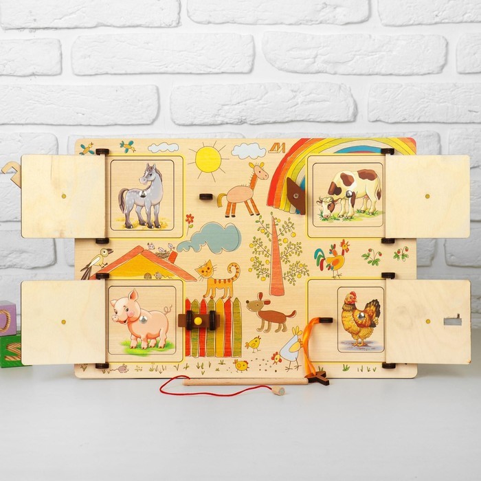 Бизиборд - игрушка, которая опробована педагогами, разработчиками методик обучения, а также непосредственно родителями малышей. Бизиборд - доска, в процессе игры с которой ребёнок будет познавать мир,... Показать описание ознакомится с предметами быта, а также получит навыки самообслуживания (завязывание шнурков, застёгивание молнии и мн.др). Несомненные плюсы бизиборда: * изучение различных свойств предметов; * формирование навыков открывания и закрывания различных замков; * развитие мелкой моторики и самостоятельности. 5 тактильных элементов: * 2 фетровых окошка * липучка * 2 шестерёнки