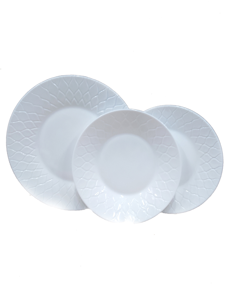 толовый сервиз Luminarc AMARIO WHITE рассчитан на 6 персон, состоит из 18 предметов: - Тарелка обеденная 25 см. - 6 шт. - Тарелка десертная 18 см. - 6 шт. - Тарелка глубокая 20 см. - 6 шт. Материал: ударопрочное стекло. Цвет: белый.