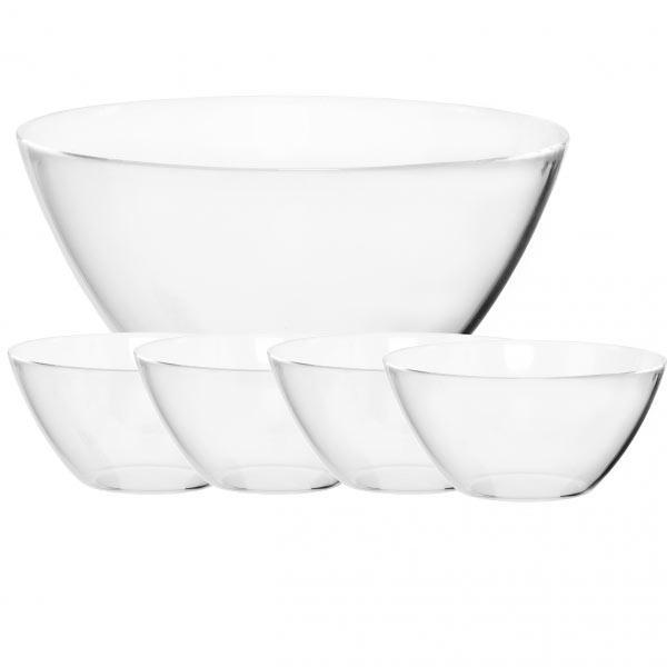 Набор салатников Cosmos J3193. В наборе 4 салатника 12см и салатник 23см изготовленные из ударопрочного прозрачного стекла.
