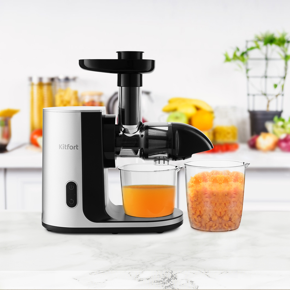 Шнековая соковыжималка Kitfort КТ-1125 с горизонтальным отжимом позволяет на низких оборотах бережно отжимать максимально возможное количество сока из фруктов, овощей и зелени, сохраняя все полезные вещества: витамины, аминокислоты и минералы.