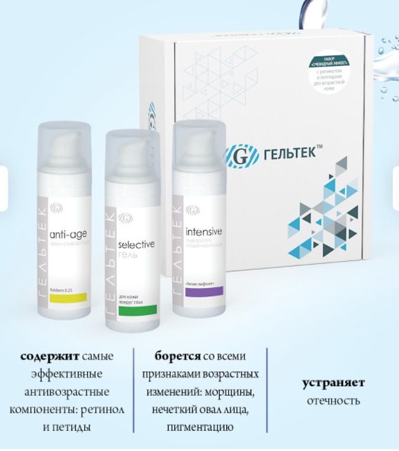 Специалисты компании разработали серии косметики для домашнего использования и для аппаратной косметологии под брендом Гельтек для решения самых различных задач в косметологии: серия для ухода за зрелой кожей, серия для ухода за сухой и чувствительной кожей, серия по уходу за жирной и проблемной кожей, серия по уходу за телом, серия препаратов интенсивного действия (сыворотки, концентраты).