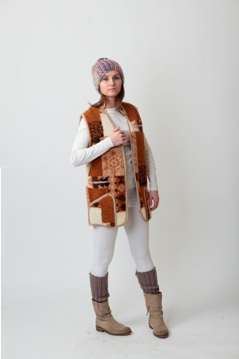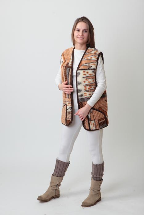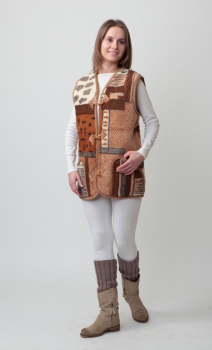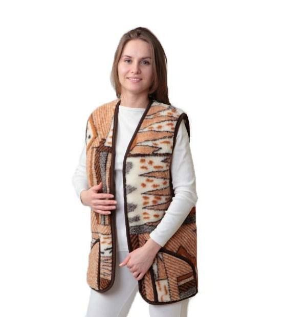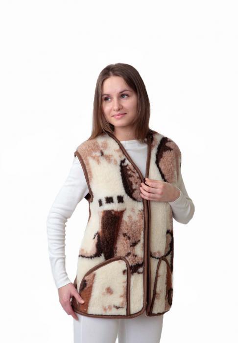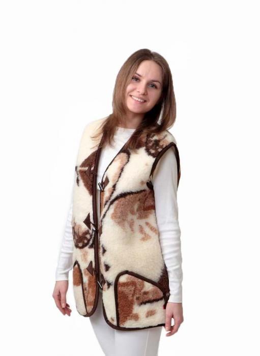 Жилет из шерсти мериноса (овечьей шерсти) Состав: овечья шерсть 100% Модель: прямая классическая, без воротника Цвет: принт Длина: удлиненная Застежка: пуговицы-клеванты Карманы: накладные Отделка: ве... Показать описаниелюровый кант Жилеты из овечьей шерсти хорошо впитывают влагу. Естественные воздушные прослойки между волокнами шерсти обеспечивают хорошую тепловую защиту от проникновения холода. Одежда из натуральной шерсти отличается хорошей износостойкостью.