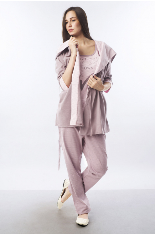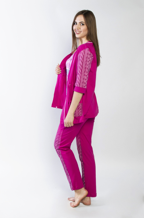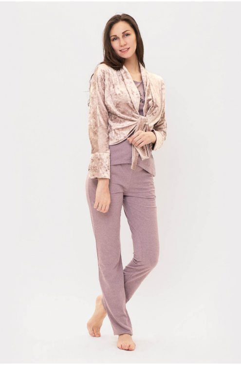 Модель: Комплект "Баланс" Материал:  кулирка+велюр Состав: 100% хлопок, 80% хлопок 20% пэ Размерный ряд: 44-54 Комплект Баланс придется по душе девушкам и молодым женщинам. Произведено из кулирки и ве... Показать описаниелюра. В наборе 3 детали: брюки, кофточка и футболка. Свободные штаны прямого кроя не стесняют движения. В них удобно не только сидеть, но и заниматься делами. Футболка слегка приталена. Украшена стильной надписью на английском языке. Комплект дополняет кофточка на пояске. Материалом для штанов и футболки служит кулирка. Кофта выполнена из велюра с отделкой. Удобный домашний костюм для вечернего просмотра телевизора.