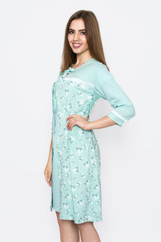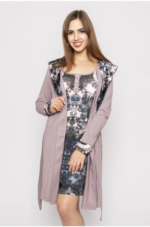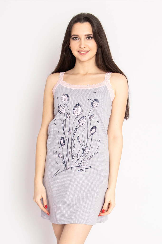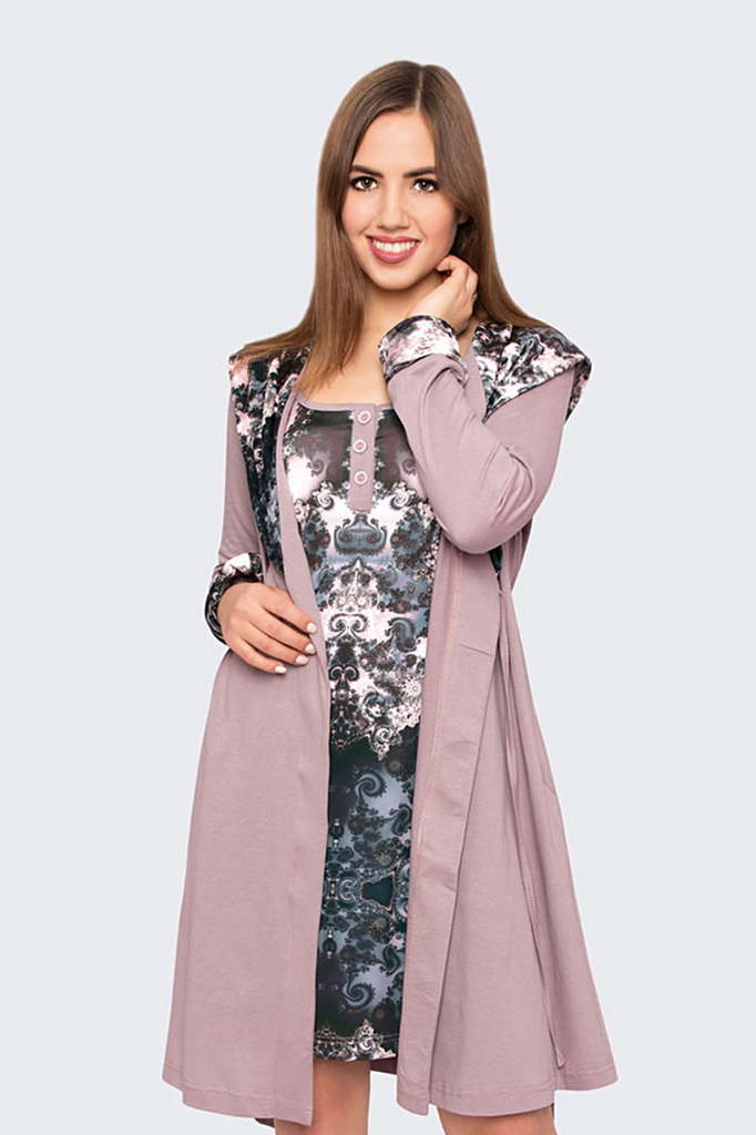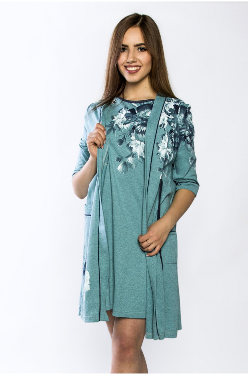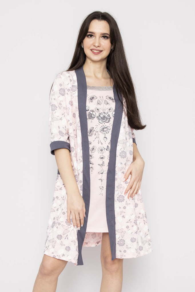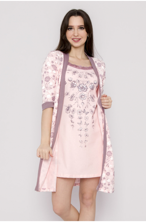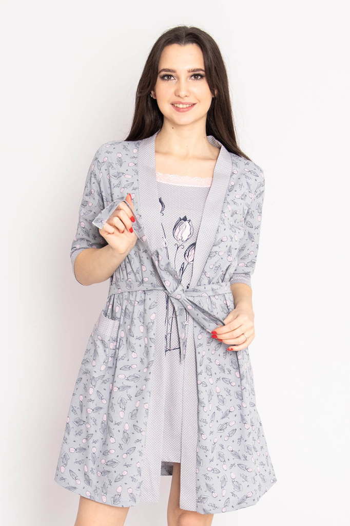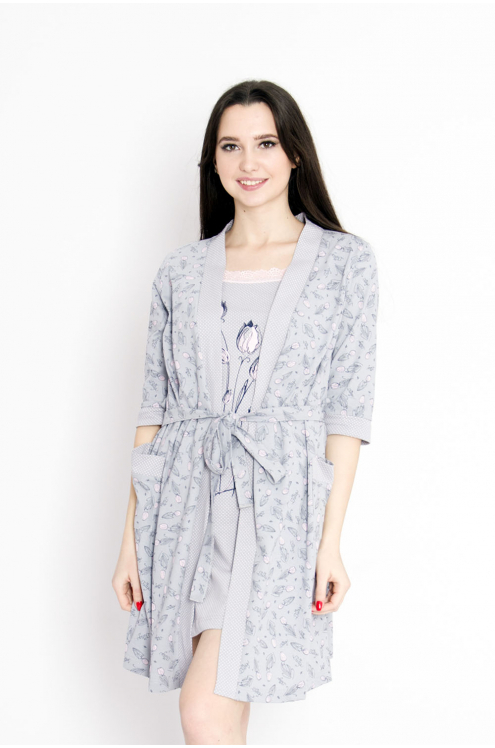 Модель: Комплект "Балет" Материал: кулирка Состав: 100% хлопок Размерный ряд: 44-54 Цвета: в ассортименте Нежный комплект "Балет, состоящий из приталенной сорочки на бретелях, украшенной принтом в вид... Показать описаниее балеток, и халата с запахом, отделанного по полочкам, рукавам и карманам кантом в тон сорочки.  Такой комплект  – это удобный домашний наряд для женщин. Выполнен из дышащей кулирки.  Халат фиксируется на талии при помощи пояса.