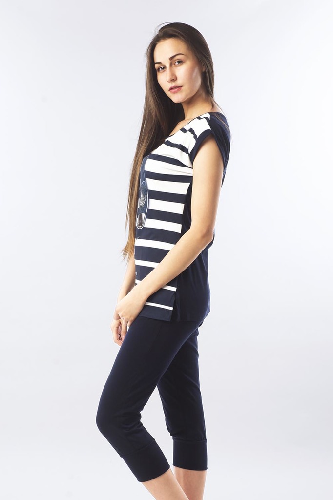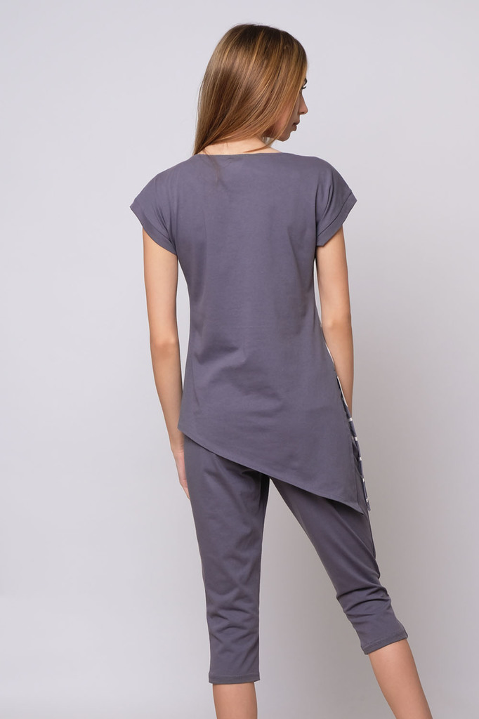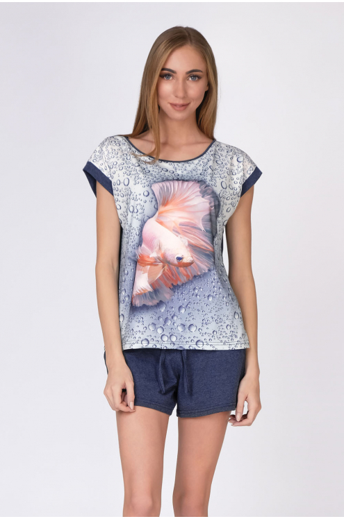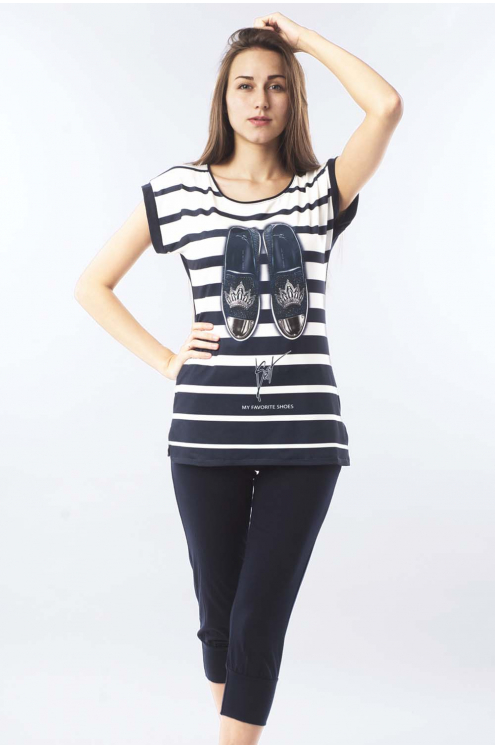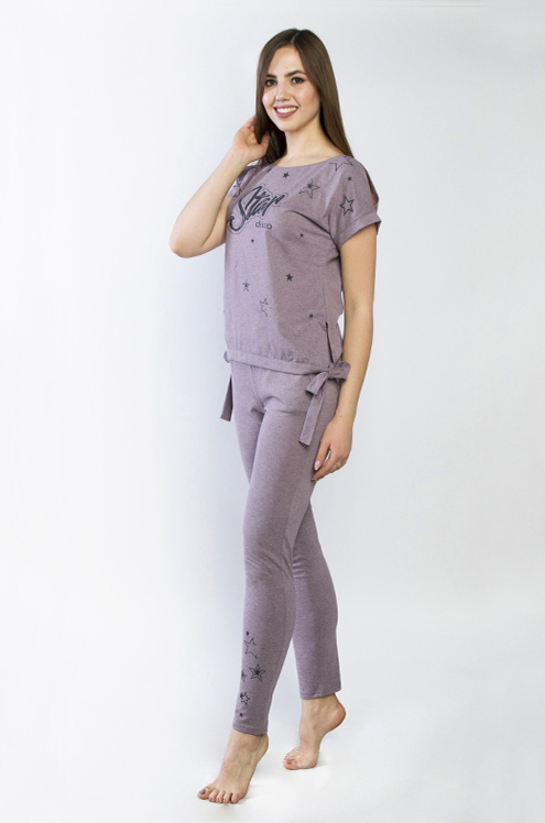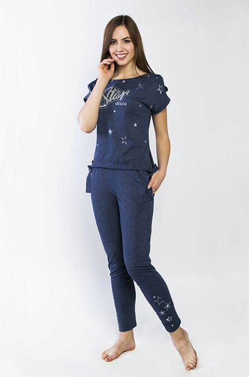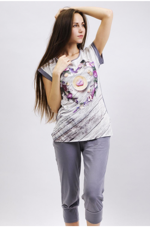 Модель: Комплект "Джинсы" Материал: кулирка  Состав:100% хлопок Размерный ряд: 42 - 54 Молодежный комплект Джинсы станет любимым домашним нарядом для девушки или женщины. Он выполнен из приятного мате... Показать описаниериала - кулирка. Состоит из 2 элементов: футболки и бридж. Футболка немного удлиненная, крой приталенный. На полочке нанесен яркий рисунок. Низ – это обтягивающие бриджи, декорированные под джинсовую ткань. Фиксируются на поясе не тугой резинкой. Стильный домашний образ на каждый день.