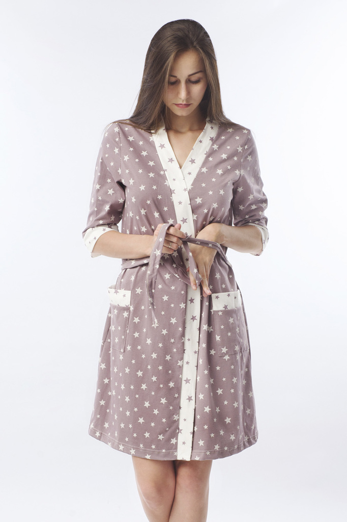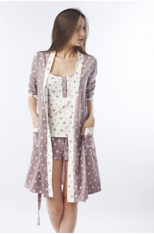 Модель: Комплект "Звездопад"  Материал: кулирка Состав: 100% хлопок Размерный ряд: 44-54 Домашний комплект "Звездопад" просто создан для юных модниц. Для пошива используется практичный материал – кули... Показать описаниерка. В набор входят майка, шорты и халат. Все изделия имеют свободный крой. Халат слегка длиннее шорт. Его можно использовать отдельно при необходимости. Фиксируется на талии при помощи пояса. Украшен россыпью звезд, придающие легкость. Элегантный и уютный наряд для отдыха и сна.