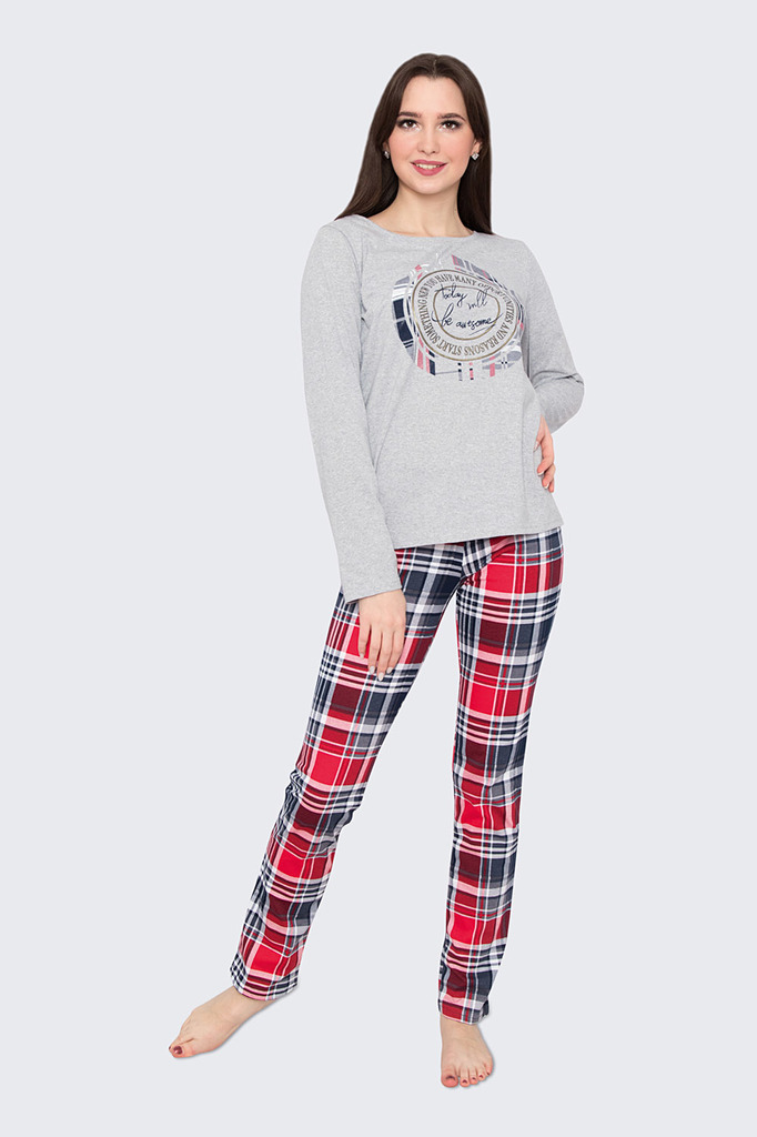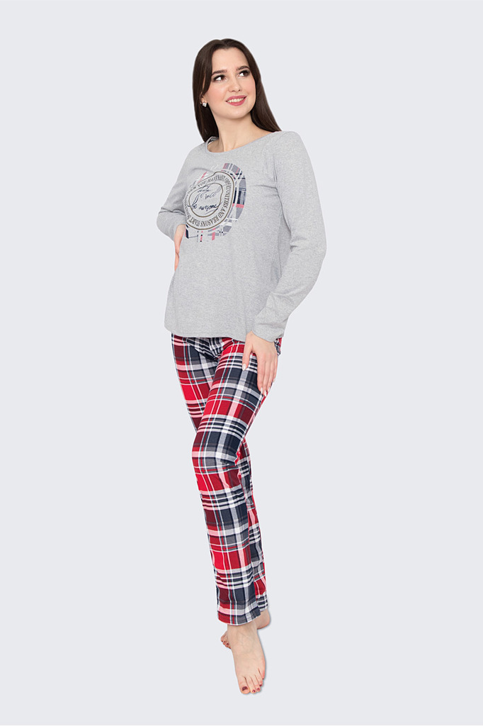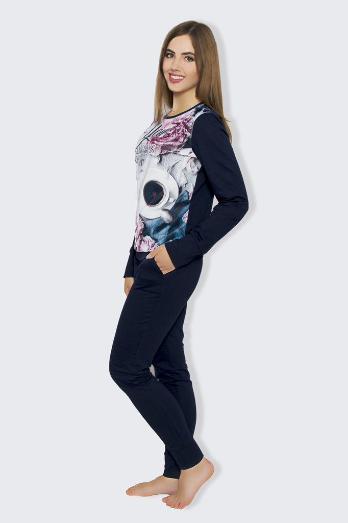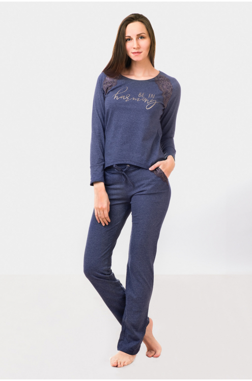 Модель: Комплект "Гармония" Материал:  кулирка Состав: 70% хлопок, 30% пэ Размерный ряд: 44-58 Комплект Гармония для девушек и женщин согреет осенним вечером. Материалом служит кулирка, плотный, но ле... Показать описаниегкий. В наборе 2 предмета: кофта и штаны. Брюки имеют прямой крой. Они визуально удлиняют ноги. Фиксируются при помощи шнура на талии. Длина брюк доходит до щиколоток. Кофточка теплая с длинным рукавом. Горловина полукруглой формы. Фасон свободный, не выделяет талию и живот. На груди расположен стильный принт. Домашний брючный костюм создаст уют и поможет расслабиться после работы.