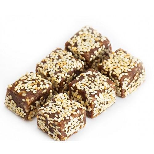 Коробка конфет 100 г - 6 больших конфет. Полезные конфеты Русские традиции, благодаря своему натуральному составу не только вкусные, но и очень полезные. Основной ингридиент - это финики, а в них очен... Показать описаниеь много витаминов, солей и минералов, необходимых для нормального функционирования организма человека. 23 вида различных аминокислот, которые отсутствуют в большинстве других фруктов. Наши конфеты богаты незаменимой аминокислотой триптофаном, который также необходим для оптимального функционирования мозга и сохранения нормального психического состояния, особенно в пожилом возрасте. Триптофан препятствует старению: достаточное количество его в пище позволяет приостановить процессы старения клеток. Кроме того, благодаря триптофану финики имеют мягкое успокаивающее и снотворное действие. Кроме триптофана финики содержат и другую аминокислоту — глютаминовую, которая препятствует возникновению изжоги, нейтрализуя излишнюю желудочную кислоту. Так, минеральные вещества представлены фосфором (30-350 мг/100 г), кальцием (34-60 мг/100 г), железом (0,7-6,0 мг/100 г), калием (до 700 мг/100 г), натрием (до 1 мг/100 г), медью, магнием, цинком, марганцем, алюминием, кадмием, кобальтом, серой, бором и др. Витамин В (0,07-0,09 мг/100 г), В2 (0,05-0,1 мг/100 г), В5 (0,1-2,2 мг/100 г), витамин С (до 30 мг/100 г), а также пантотеновая кислота (В5), ниацин, витамины А, А1. Пектин (0,5-3,9 %). Пищевые волокна (6,4—11,5 %). Бета-каротин (30-145 мг/кг). Фтор, защищающий зубы от кариеса. Селен, снижающий риск раковых заболеваний, укрепляющий иммунную систему и снижающий риск сердечных заболеваний. Благодаря сочетанию огромного количества сахаров (глюкозы и фруктозы (26-55%), которые быстро усваиваются организмом) с витамином В5, плоды финиковой пальмы обладают ценным свойством не только быстро утолять голод, но и восстанавливать физическую силу, энергию и свежесть мозга и нервов. Как и большинство растительной пищи, финики не содержат холестерина. Соства: финики, какао и все Не содержит: сахар, красители, ароматизаторы, консерванты! Пищевая ценность на 100 г продукта: белки - 14 гжиры - 27 гуглеводы - 51 г Энегретическая ценность: 436 Ккал/1820 КДж Условия хранения: при температуре от 0 до +25 и относительно влажности воздуха не более 75% Срок годности: 3 месяца. Смесь формируется на основе сухофруктов, орехов, злаков. Конфеты с кунжутом и корицей ТУ 9196-001-51094118-2015