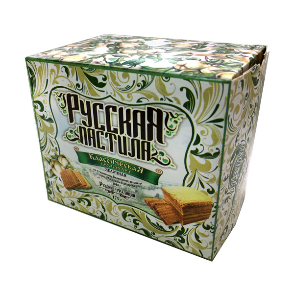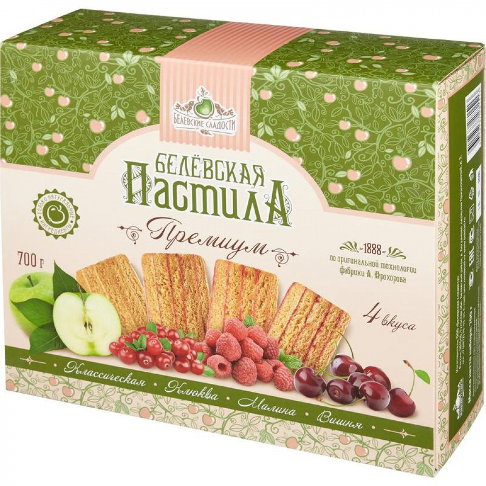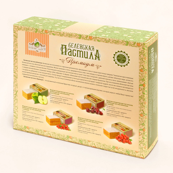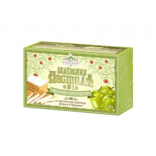 Сначала яблоки пекут в печи, затем снимают шкурку и отделяют мякоть, которую взбивают с сахаром и яичным белком. Воздушную смесь запекают пластами толщиной с дамский пальчик в печи, промазывают яичным... Показать описание белком, соединяют между собой, обрезают по форме и натирают сахарной пудрой. Пастила обретает вид сладкой буханочки. Затем выдерживают в печи при небольшой температуре для пропитки 8 часов. Весь процесс занимает более двух суток и получается лакомство кисло-сладкое на вкус и тающее во рту. В 1888 году промышленник и купец Амвросия Павловича Прохорова на основе народных рецептов, которые он обобщил, получил свой собственный рецепт пастилы. Белёвская пастила (также известная как «прохоровская»), быстро завоевала свой первый приз на выставке садоводства в Санкт-Петербурге, став одним из любимых лакомств царской семьи. Белёвскую пастилу стали охотно покупать во многих городах России, а также экспортировать для высоких особ Франции, Испании, Италии, Болгарии, Голландии, Англии и многих других стран. Состав: яблоки, сахар-песок, белок яичный. Пищевая ценность в 100г: белки: 1,2 г, углеводы: 71,4 г Энергетическая ценность в 100г: 1214 кДж/290 ккал Условия хранения: хранить при температуре от +5 до +25 °С и относительной влажности воздуха 75-80 %, не подвергать воздействию прямого солнечного света. Срок годности: 4 месяца при соблюдении условий хранения.