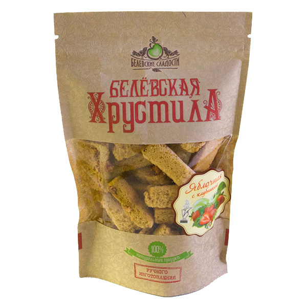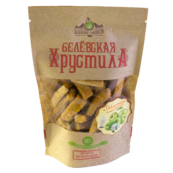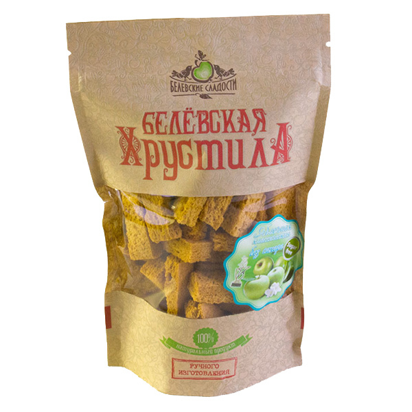 Белёвская хрустила – это вкусный и полезный десерт. При приготовлении запеченные яблоки взбиваются с яичным белком, сахаром и выпекаются в печи. Весь процесс занимает более двух суток и получается лак... Показать описаниеомство кисло-сладкое на вкус и тающее во рту. Затем пастилу нарезают и сушат ещё сутки - тогда получается великолепная Белёвская Хрустила! На прилавках магазинов много аналогичной продукции, однако Белёвские “хрустики” неизменно востребованы покупателями потому, что они уникальны: Только натуральные компоненты! В состав хрустилы входят только натуральные ингредиенты. Рецепт ее изготовления весьма трудоемкий. Классическая хрустила изготавливается из яблок, сахара и яичного белка. При изготовлении других видов хрустилы добавляются: корица, мед, ягоды. Ручное приготовление. Вся продукция выпекается вручную. Это значит, что контроль качества происходит на каждом этапе выпечки. Каждый хрустик хранит заботу и тепло человеческих рук! Строгое соблюдение рецептуры 1888 года при изготовлении пастильных пластов для производства хрустилы. В то далекое время Белёвские сладости поставлялись не только к столу российского монарха, но а также во Францию, Германию, Италию и т.д.. Так как рецептура уже зарекомендовала себя, она не изменяется, а значит – наша продукция неизменно вкусна, качественна и полезна! Состав: печеные яблоки, сахар-песок, белок яичный. Пещевая ценность в 100 г продукта: Белки - 1,6 г Углеводы - 91 г Жиры - 0г . Энергетическая ценность на 100г продукта: 1550 кДж/370 ккал Хранить при температуре от +5 до +25С и относительной влажности воздуха не более 75%, не подвергать воздействию прямого солнечного света. Срок годности: 6 месяцев при соблюдении условий хранения.