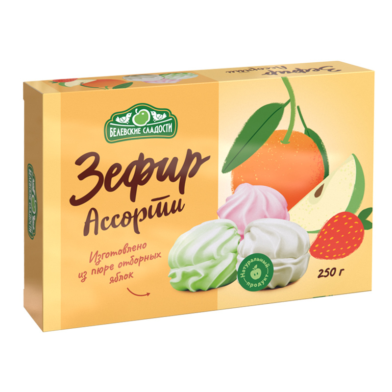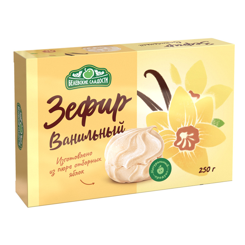 Зефир — не только аппетитное, но еще и полезное для здоровья лакомство. Его можно без опаски давать детям — от его употребления у них не будут разрушаться зубы и не возникнет кариес. Изначально лакомс... Показать описаниетво изготавливали из сахара и яблочного пюре. Со временем состав сладости видоизменялся — в него добавляли белки и другие компоненты. Польза зефира обусловлена содержанием в его составе загустителей. Зефир на основе пектина имеет очень большое благоприятное воздействие на организм. Он понижает количество холестерина в сосудах, выводит из организма токсические вещества, а также соли тяжелых металлов. Благодаря пектину уровень сопротивляемости организма различным заболеваниям повышается. Зефир из пектина максимально легкий и воздушный, имеет характерную приятную кислинку. Богатый на железо, фосфор и другие компоненты, полезен зефир также для ногтей, волос и сосудов. Изделие кондитерское пастильное: Белёвский зефир Крем-брюле. Состав: сахар, пюре яблочное, патока, желирующий агент-пектин яблочный, белок яичный сухой, ароматизатор натуральный, краситель натуральный. Пищевая ценность в 100г: белки: 0,8 г, жиры: 0,1 г, углеводы: 79,8 г Энергетическая ценность в 100г: 1340 кДж/320 ккал. Условия хранения: хранить при температуре (18±3)°С и относительной влажности воздуха не более 75 %, не подвергать воздействию прямого солнечного света. Срок годности: 3 месяца при соблюдении условий хранения