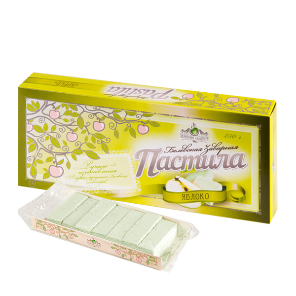 Сначала яблоки пекут в печи, затем снимают шкурку и отделяют мякоть, которую взбивают с яичным белком. Воздушную смесь запекают пластами толщиной с дамский пальчик в печи, промазывают яичным белком, с... Показать описаниеоединяют между собой и обрезают по форме. Пастила обретает вид сладкой буханочки. Весь процесс занимает более двух суток и получается лакомство кисло-сладкое на вкус и тающее во рту. В 1888 году промышленник и купец Амвросий Павлович Прохоров на основе народных рецептов, которые он обобщил, получил свой собственный рецепт пастилы. Белёвская пастила быстро завоевала свой первый приз на выставке садоводства в Санкт-Петербурге, став одним из любимых лакомств царской семьи. Белёвскую пастилу стали охотно покупать во многих городах России, а также экспортировать для высоких особ Франции, Испании, Италии, Болгарии, Голландии, Англии и многих других стран. Состав: яблоки, белок яичный. Пищевая ценность в 100г: белки: 1,0 г, углеводы: 36,5 г Энергетическая ценность в 100г: 628 кДж/150 ккал Условия хранения: хранить при температуре от +5 до +25 °С и относительной влажности воздуха 75-80 %, не подвергать воздействию прямого солнечного света. Срок годности: 4 месяца при соблюдении условий хранения.