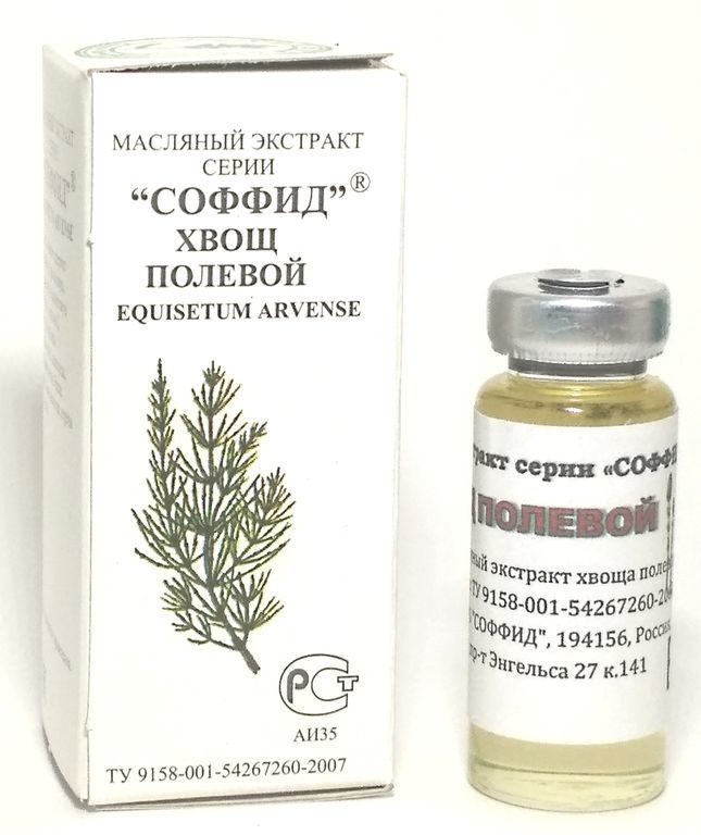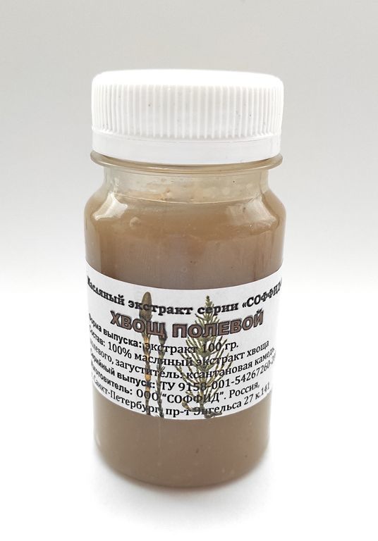 Масляный экстракт хвоща полевого 12гр. Состав: 100% масляный экстракт из травы хвоща. Показания: дряблость и обвислость кожи, морщины, отёчность лица, капиллярная сетка, мешки и синяки под глазами, шр... Показать описаниеамы, рубцы, отеки ног, синяки, ушибы, варикозное расширение вен, тромбофлебит глубоких вен, ломкость ногтей, целлюлит, послеродовые растяжки. Применение: смазывать, либо втирать в кожу массажными движениями 1-2 раза в день. Противопоказания: индивидуальная непереносимость. Хранить в темном месте, при комнатной температуре. ПОКАЗАНИЯ И ПРИМЕНЕНИЕ ПРИВЕДЕНЫ ПО МАТЕРИАЛАМ НАРОДНОЙ МЕДИЦИНЫ!
