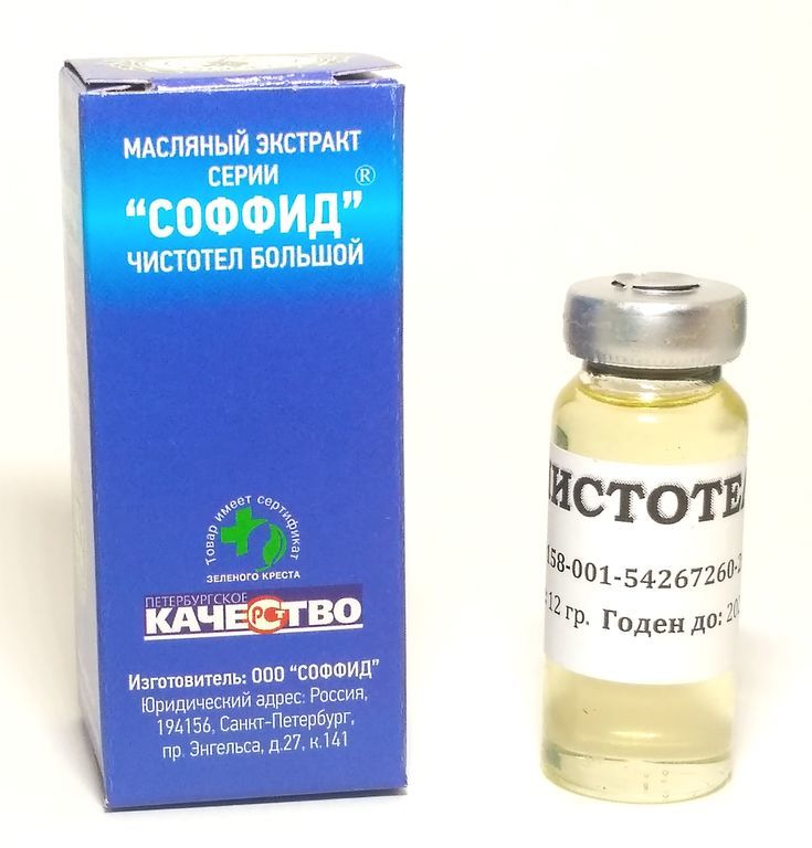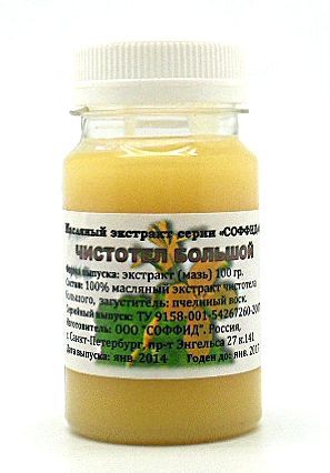 Масляный экстракт из травы чистотела 12гр. Состав: 100% масляный экстракт травы чистотела. Показания: Выводит сухие мозоли, бородавки, папилломы, кожно-ногтевой грибок. Убирает угри, прыщи, пигментные... Показать описание, возрастные, печёночные пятна. Применяется при экземе, диатезе и ороговевших пятках. Способ применения: смазывать ватным тампоном, примочки, компрессы от 1 до 2 раз в день, в зависимости от сложности заболевания. Курс от 1 недели до 3 месяцев. Противопоказания - индивидуальная непереносимость. Хранить в темном месте, при комнатной температуре. ПОКАЗАНИЯ И ПРИМЕНЕНИЕ ПРИВЕДЕНЫ ПО МАТЕРИАЛАМ НАРОДНОЙ МЕДИЦИНЫ!