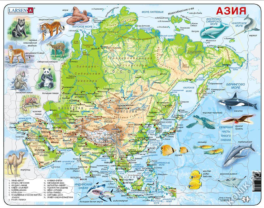 Яркий качественный пазл норвежской фирмы Larsen поможет ребенку интересно провести время и изучить страны Азии, а также обитающих в них птиц и животных. Русифицированный пазл состоит из большого колич... Показать описаниеества элементов, на которые нанесены надписи крупных городов, рек, изображения животных, рельефа и прибрежных территорий. Пазл Ларсен Азия станет прекрасным дидактическим пособием на уроках географии и естествознания, поможет детям с большим увлечением заниматься дома дополнительными уроками в интересной форме. В наборе: 63 элемента пазла. Размер собранного поля - 36,5 х 28,5 см.