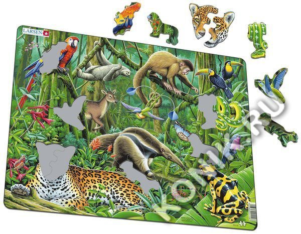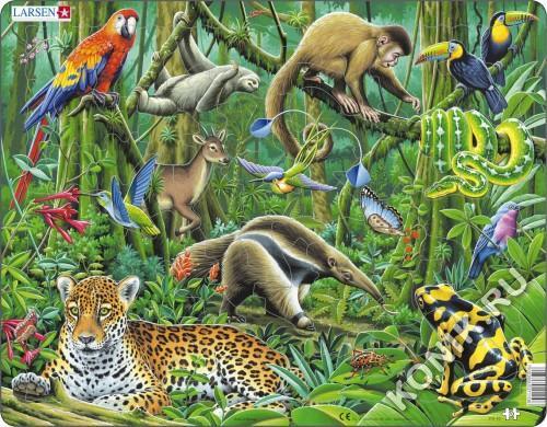 Пазлы Ларсен - это красочные обучающие пазлы, которые наглядно рассказывают малышам о природе. Яркая серия Флора и Фауна предназначена для детей от 6 лет. С фотографической точностью прорисованы обита... Показать описаниетели и растительный мир самых отдаленных уголков планеты. Различные формы вырубки и размеры отдельных элементов способствуют развитию мелкой моторики у малышей. Выполненные из высококачественного трехслойного картона, они не деформируются и легко берутся в руки. Все пазлы снабжены специальной подложкой, благодаря чему их так легко собирать. Виды с верхнего левого угла: красный ара, ленивец, красный ревун, тукан, колибри, мазама, знамёнщик Ундервуда, бабочка голубой Морфо, зелёный древесный удав, пурпурногрудая настоящая котинга, гигантский муравьед, ягуар, жук, лягушка. В наборе: 70 элементов пазла. Размер собранного поля - 36,5 х 28,5 см.