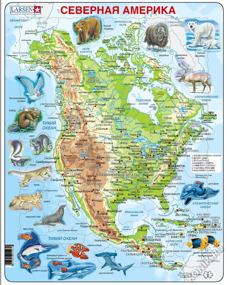 Большой красочный пазл познакомит детей со штатами, расположенными на континенте Северной Америки. На поле и деталях пазла изображен рельеф, нанесены надписи крупных городов и рек, яркие реалистичные ... Показать описаниеизображения птиц и животных, которые сформируют представление о флоре и фауне материка. Пазл Ларсен Северная Америка станет прекрасным дидактическим пособием на уроках географии и естествознания, поможет детям с большим увлечением заниматься дома дополнительными уроками в интересной форме. В наборе: 66 элементов пазла. Размер собранного поля - 36,5 х 28,5 см. Пазл Северная Америка русифицирован.