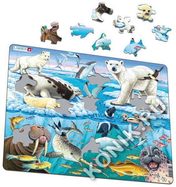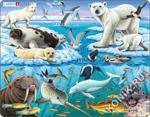 Пазлы Ларсен - высококачественные обучающие пазлы. Яркая серия Флора и Фауна представляет жителей Арктики. Когда ребенок соберет пазл целиком, он сможет подробно рассмотреть необычных животных, которы... Показать описаниех можно встретить только в зоопарке. Пазлы - увлечение для всей семьи, можно собирать один пазл несколько раз или каждый раз радовать себя и родных новой увлекательной мозаикой. Пазлы Ларсен выполнены из плотного картона, он не деформируется, приятен на ощупь. Специальная подложка позволяет крепко соединять детали. Виды слева направо, над водой: песец, гренландский тюлень и тюленёнок, полярные крачки, горбатый кит, моёвка, полосатый тюлень, белая медведица и медвежонок, морянки (утка и селезень), короткохвостый поморник. Виды под водой: треска, морж, кальмары, люрик, криль, нарвал, белуха, краснозобая гагара, морской окунь, треска, хохлач. В наборе: 75 элементов пазла. Размер собранного поля - 36,5 х 28,5 см.