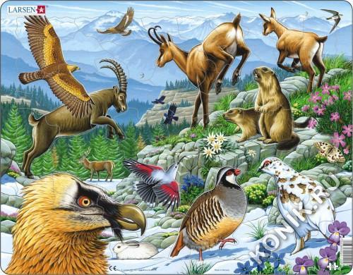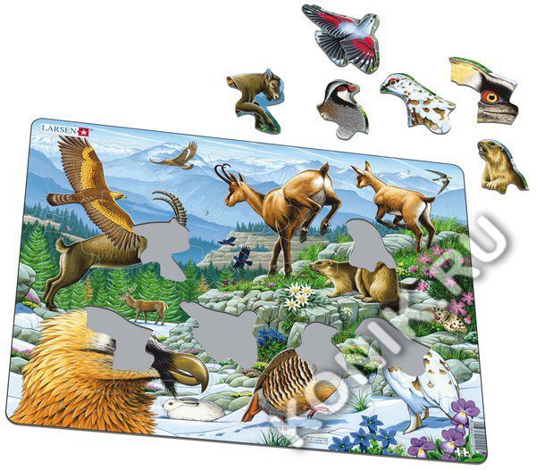 Пазлы Ларсен - качественные обучающие пазлы с яркими изображениями. Красочная серия Флора и Фауна предназначена для детей от 6 лет. С фотографической точностью прорисованы обитатели и растительный мир... Показать описание самых отдаленных уголков планеты. Многообразие форм вырубки и различные размеры отдельных элементов способствуют развитию мелкой моторики у малышей. Детали пазла выполнены из высококачественного трехслойного картона, они не деформируются и легко берутся в руки. Все пазлы снабжены специальной подложкой, благодаря которой их удобно соединять. Виды: беркут, горный козёл, альпийские галки, серна и козлёнок, сурки, белобрюхий стриж, благородный олень, краснокрылый стенолаз, эдельвейс, альпийская гвоздика, бабочка альпийский аполлон, гриф, заяц-беляк, куропатка, розовая сапонария, горечавка, красная куропатка, фиалка. В наборе: 55 элементов пазла. Размер собранного поля - 36,5 х 28,5 см.