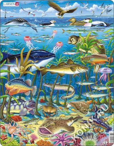 Яркая серия Флора и Фауна норвежской фирмы Ларсен представляет пазл, на котором представлены обитатели морских глубин. Разнообразные рыбки,птички и растения будут радовать малыша, когда он сможет собр... Показать описаниеать все детали вместе. Благодаря яркому развивающему набору у детей формируется образное и логическое мышление, развивается внимание, память. На пазле представлены обитатели Северного моря. Виды: чайки, крачки, белохвостый орлан, баклан (наверху справа), чернозобая гагара, тупик, гага (утка и селезень), сельдь, компасная медуза, рыба-игла (морская щука), тюлень, морская свинья, треска, пятнистый губан, медуза, морской воробей, линг, макрель, зубатка, карманный краб, морской гребешок, камбала, морской ёж, красная морская звезда (porania pulvillus), королевский краб, различные актинии и губки, большой морской дракон, морской чёрт, фиолетовая морская звезда (большая морская звезда), моллюски, морские анемоны, лобстер. Детали пазла выполнены из трехслойного картона, не деформируются и удобны для маленьких детских ручек. В наборе: 60 элементов пазла. Размер собранного поля - 36,5 х 28,5 см.