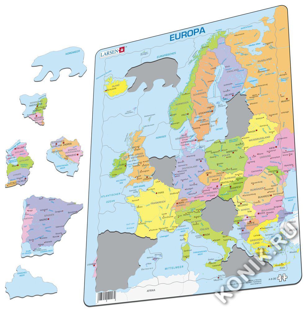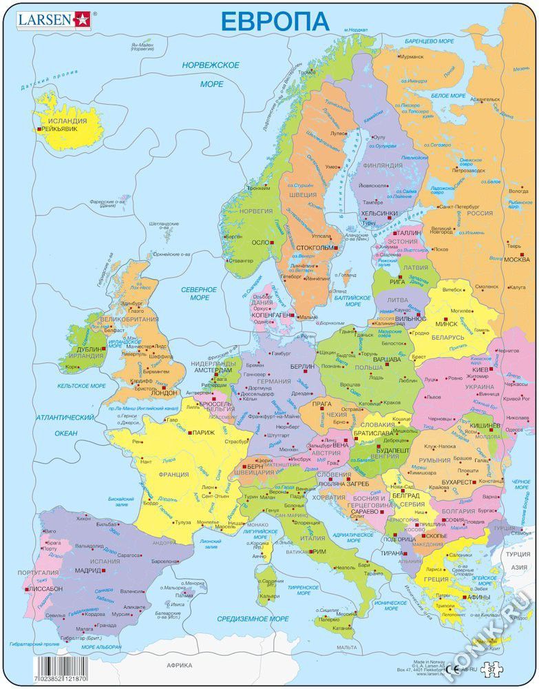 Пазлы Ларсен - это прежде всего обучающие пазлы. Пазл Политическая карта Европы переведен на русский язык, подписаны названия стран и крупнейшие в них города. Многообразие форм вырубки и различные раз... Показать описаниемеры отдельных элементов способствуют развитию мелкой моторики у детей. Сделанные из высококачественного трехслойного картона, они не деформируются и легко берутся в руки. Все пазлы снабжены специальной подложкой, благодаря чему их удобно собирать. Предназначен для детей старшего возраста и взрослых. В наборе: 37 элементов пазла. Размер собранного поля - 36,5 х 28,5 см.