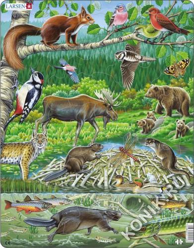 Яркая серия Флора и Фауна норвежской фирмы Ларсен представляет пазл, на котором представлены лесные жители. С фотографической точностью прорисованы обитатели и растительный мир самых отдаленных уголко... Показать описаниев планеты. Благодаря яркому развивающему набору у детей формируется образное и логическое мышление, развивается внимание, память. На пазле представлена природа лесов северных стран. Виды животных: красная белка на осине, зяблик (самец), 2 клёста (самец=красный, самка=зелёная), большой пёстрый дятел, сойка, ястребиная сова, репейница (бабочка), лось, бурая медведица с медвежатами, рысь, бобёр, стрекоза (красно-жильный Дартер), выдра, чирок (селезень и утка); под водой: наверху слева две рыбы: голец (самец=с красным брюхом, самка за ним), бобёр, озёрная форель (наверху справа), щука (внизу справа) и молодь форели. Фон — нора бобра в пруду, берёзовый лес и вдали хвойный лес. Детали пазла выполнены из трехслойного картона, не деформируются и удобны для маленьких детских ручек. В наборе: 45 элементов пазла. Размер собранного поля - 36,5 х 28,5 см.