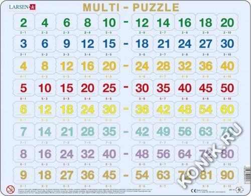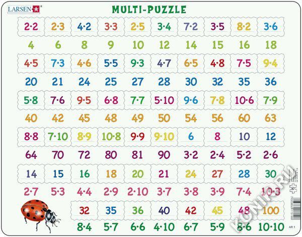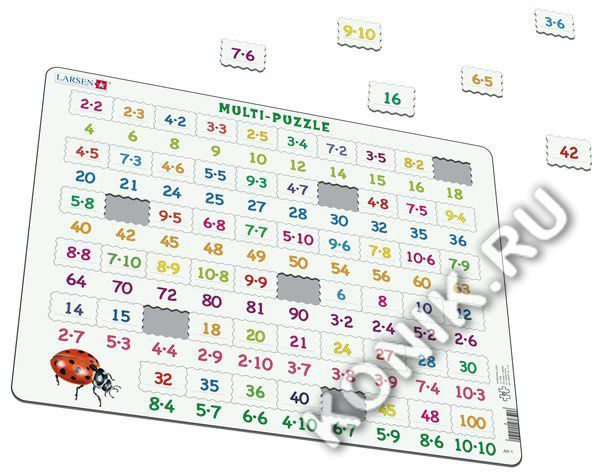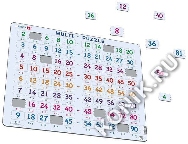 Пазлы Ларсен - это прежде всего обучающие пазлы. Мульти-Пазл относится к серии "Математика" и знакомит детей от 4 лет с таблицей умножения в игровой форме. На самом картоне напечатаны ответы, а детям ... Показать описаниенеобходимо найти соответствующее умножение. Многообразие форм вырубки и различные размеры отдельных элементов способствуют развитию мелкой моторики у малышей. Сделанные из высококачественного трехслойного картона, они не деформируются и легко берутся в руки. Все пазлы снабжены специальной подложкой, благодаря чему их удобно собирать. В наборе: 58 элементов пазла. Размер собранного поля - 36,5 х 28,5 см.