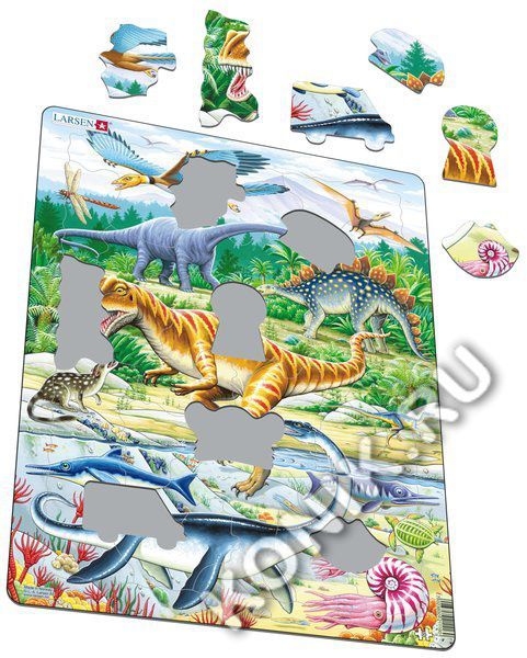 Необычные динозавры и другие вымершие существа предстанут перед Вами, если правильно собрать удивительный пазл от компании Ларсен. Яркие картинки, качественная полиграфия и безопасные материалы - пазл... Показать описаниеы Ларсен. На пазле представлен Животный мир Юрского периода. Виды (слева направо, сверху вниз): стрекоза, археоптерикс, рамфоринх, птеродактиль, барозавр, стегозавр, синоконодон (протомлекопитающее), аллозавр (большой хищный динозавр), орнитолестес, ихтиозавр, плезиозавр, офтальмозавр (наверху справа под водой), аммонит, архелон (черепаха). -Также: белемниты (моллюск), морские лилии, кораллы, ракушки. На суше: папоротник, древовидный папоротник, хвойные деревья. Приятные на ощупь детали пазла идеально подходят для детских ручек. Пазл удобно собирать, детали хорошо крепятся друг к другу. В процессе игры у ребенка развивается воображение и память, тренируется мелкая моторика. В наборе: 35 элементов пазла. Размер собранного поля - 36,5 х 28,5 см.