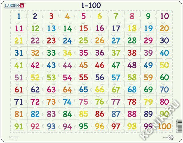 Пазлы Ларсен - это прежде всего обучающие пазлы. 1-100 Пазл относится к серии Математика и в игровой форме знакомит детей от 4 лет с последовательностью чисел в промежутке от 1 до 100. Детям необходим... Показать описаниео в правильном порядке расставить все числа внутри пазла. Многообразие форм вырубки и различные размеры отдельных элементов способствуют развитию мелкой моторики у малышей. Сделанные из высококачественного трехслойного картона, они не деформируются и легко берутся в руки. Все пазлы снабжены специальной подложкой, благодаря чему их удобно собирать. В наборе: 100 элементов пазла. Размер собранного поля - 36,5 х 28,5 см.