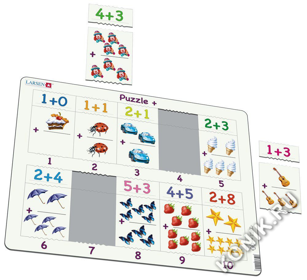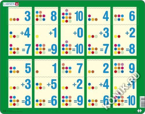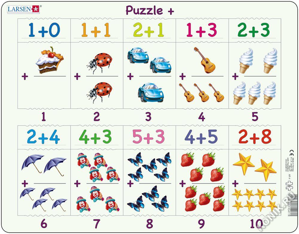 Пазлы Ларсен - это прежде всего обучающие пазлы. Пазл "Сложение 1-10b" относится к серии "Математика" и ориентирован на детей от 4 лет. Сам пример отпечатан на картоне, а детям необходимо найти правил... Показать описаниеьный ответ. Данный пазл является прекрасным дополнением к "Сложение 1-10а" и "Сложение 1-10c". Многообразие форм вырубки и различные размеры отдельных элементов способствуют развитию мелкой моторики у малышей. Сделанные из высококачественного трехслойного картона, они не деформируются и легко берутся в руки. Все пазлы снабжены специальной подложкой, благодаря чему их удобно собирать. В наборе: 10 элементов пазла. Размер собранного поля - 36,5 х 28,5 см.