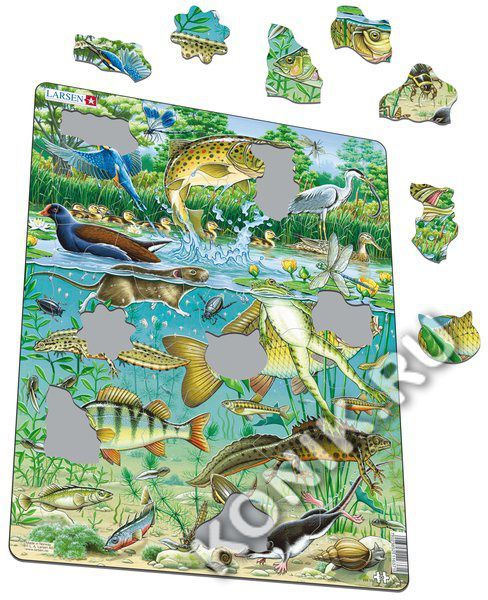 Яркая серия Флора и Фауна норвежской фирмы Ларсен представляет пазл, на котором представлены обитатели пруда. Разнообразные рыбки и птички будут радовать малыша, когда он сможет собрать все детали вме... Показать описаниесте. Благодаря яркому развивающему набору у детей формируется образное и логическое мышление, развивается внимание, память. Виды животных и растений: ива ломкая и ольха, зимородок, равнокрылая стрекоза, озёрная форель ловит подёнку, серая цапля держит угря, рогоз и тростник (травы), кряква с утятами, кувшинка белая, камышница, водяная крыса, лягушка, жёлтая кувшинка, дозорщик-император, личинка комара, дафния (водяная блоха), жуки-вертячки, обыкновенный тритон, карп, пиявка, головастики, окунь, гольян (самец и самка), гребенчатый тритон, колюшка (самец и самка), плавунец окаймлённый (и личинка, поедающая головастика), роговая улитка, водяная землеройка, большая лужанка (улитка), а также водные растения- антоцеровые, уруть, красовласка и водоросли. Детали пазла выполнены из трехслойного картона, не деформируются и удобны для маленьких детских ручек. В наборе: 50 элементов пазла. Размер собранного поля - 36,5 х 28,5 см.