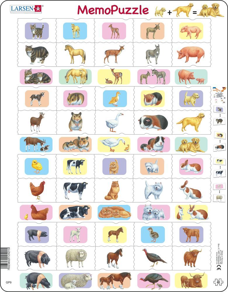 Мемопазл Животные с детёнышами — это обучающий пазл для детей. С его помощью ребенок сможет выучить названия животных и их детей. Ребенку предстоит сопоставить детали головоломки — изображение кошки с... Показать описание пазлом кошки с котенком, лошадь с жеребенком, курицу с цыпленком. Каждый пазл имеет индивидуальную форму и подходит только в нужном месте. Многообразие форм вырубки и различные размеры отдельных элементов способствуют развитию мелкой моторики у малышей. Сделанные из высококачественного трехслойного картона, они не деформируются и легко берутся в руки. Все пазлы снабжены специальной подложкой, благодаря чему их удобно собирать. В наборе: 40 деталей пазла. Размер собранного поля - 36,5 x 28,5 см.