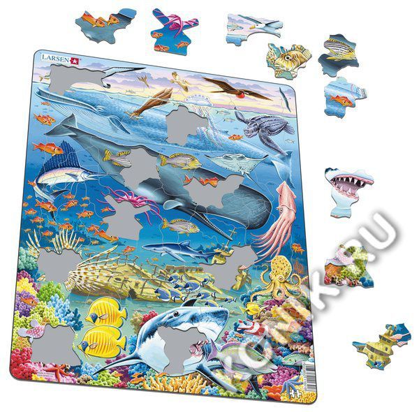 Серия Флора и Фауна норвежской фирмы Ларсен представляет пазл, на котором представлены морские обитатели. Разнообразные киты и другие животные и рыбы появятся на картинке, когда он сможет собрать все ... Показать описаниедетали вместе. Благодаря яркому развивающему набору у детей формируется образное и логическое мышление, развивается внимание, память. Детали пазла выполнены из трехслойного картона, не деформируются и удобны для маленьких детских ручек. Готовую картинку можно сохранить и разместить в качестве картины на стене детской комнаты. На пазле представлены обитатели Тихого океана: летучая рыба, странствующий альбатрос, бурая олуша (2 ныряющие птицы), пеликан, птица малый фрегат, чернобровый альбатрос, синий кит, рыба-белка/рыба-солдат (и посередине слева стая красных рыб), португальский кораблик (медуза), желтопёрый тунец (наверху вдали), кожистая черепаха, морской дьявол, парусник, полосатый сладкогуб, кашалот, гигантский кальмар, крылатка-зебра (или рыба-лев), голубая акула, рыба голубой хирург, осьминог, длинноносая рыба-бабочка, трёхполосый луциан (полоски красные и белые), пятнистый иглобрюх, 2 жёлтые рыбы-бабочки (слева), большая белая акула, скаровая рыба (2 рыбы), различные кораллы, красная и голубая морские звёзды, коралл-мозговик (внизу справа). В наборе: 66 элементов пазла. Размер собранного поля - 36,5 х 28,5 см.