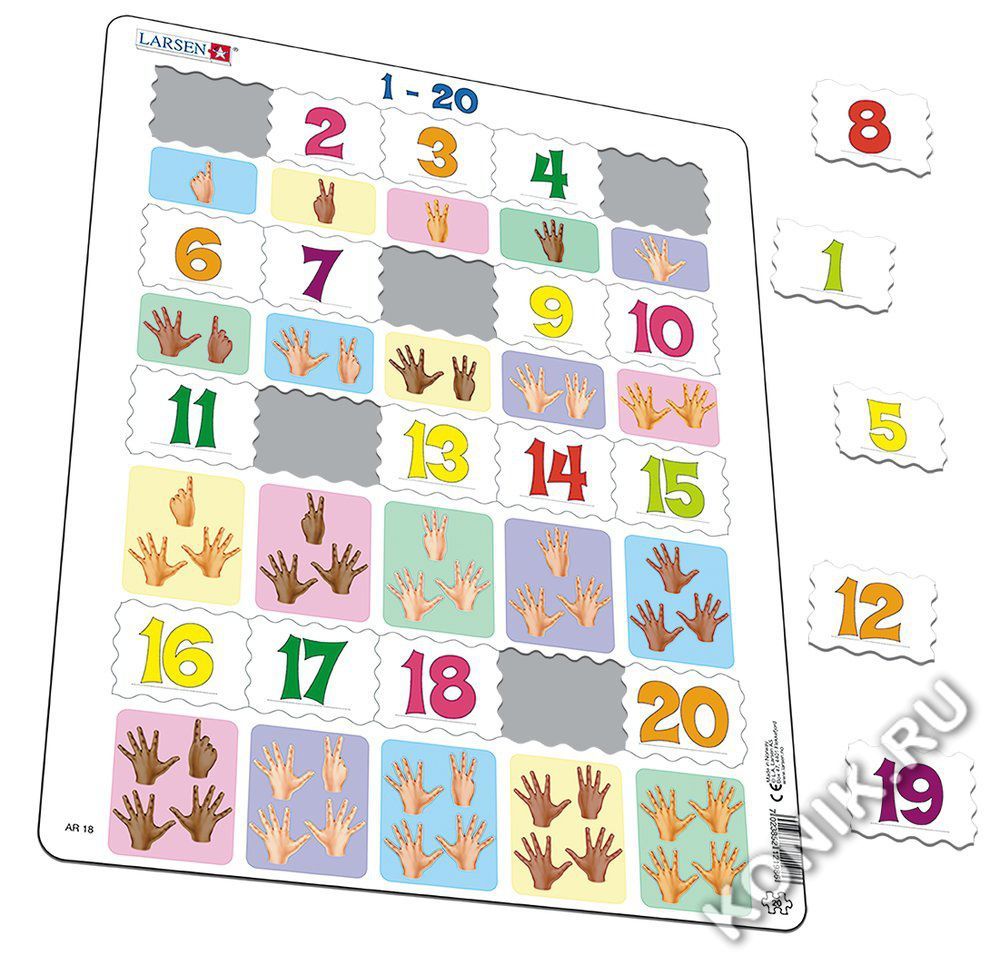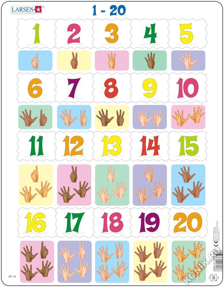 Пазлы Ларсен - это обучающие пазлы. Пазл Счёт до 20 относится к серии Математика и предназначен для самых маленьких. На картоне отпечатаны цифры от 1 до 20, и детям необходимо правильно разместить выр... Показать описаниеубленные числа над рисунками с изображением ручки с соответствующим количеством пальчиков. Многообразие форм вырубки и различные размеры отдельных элементов способствуют развитию мелкой моторики у малышей. Сделанные из высококачественного трехслойного картона, они не деформируются и легко берутся в руки. Все пазлы снабжены специальной подложкой, благодаря чему их удобно собирать. В наборе: 20 элементов пазла. Размер собранного поля - 36,5 х 28,5 см.