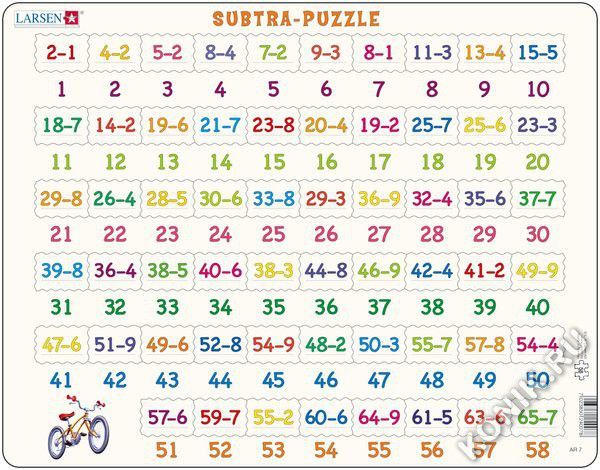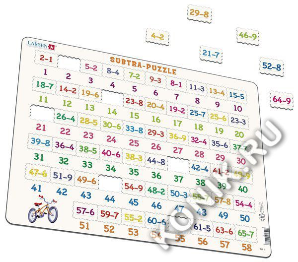 Пазлы Ларсен - это яркие обучающие пазлы. Пазл Вычитание относится к серии Математика и знакомит детей от 4 лет с примерами вычитания в игровой форме. На самом картоне напечатаны ответы, а детям необх... Показать описаниеодимо найти соответствующий пример вычитания. Многообразие форм вырубки и различные размеры отдельных элементов способствуют развитию мелкой моторики у малышей. Сделанные из высококачественного трехслойного картона, они не деформируются и легко берутся в руки. Все пазлы снабжены специальной подложкой, благодаря чему их удобно собирать. В наборе: 58 элементов пазла. Размер собранного поля - 36,5 х 28,5 см.