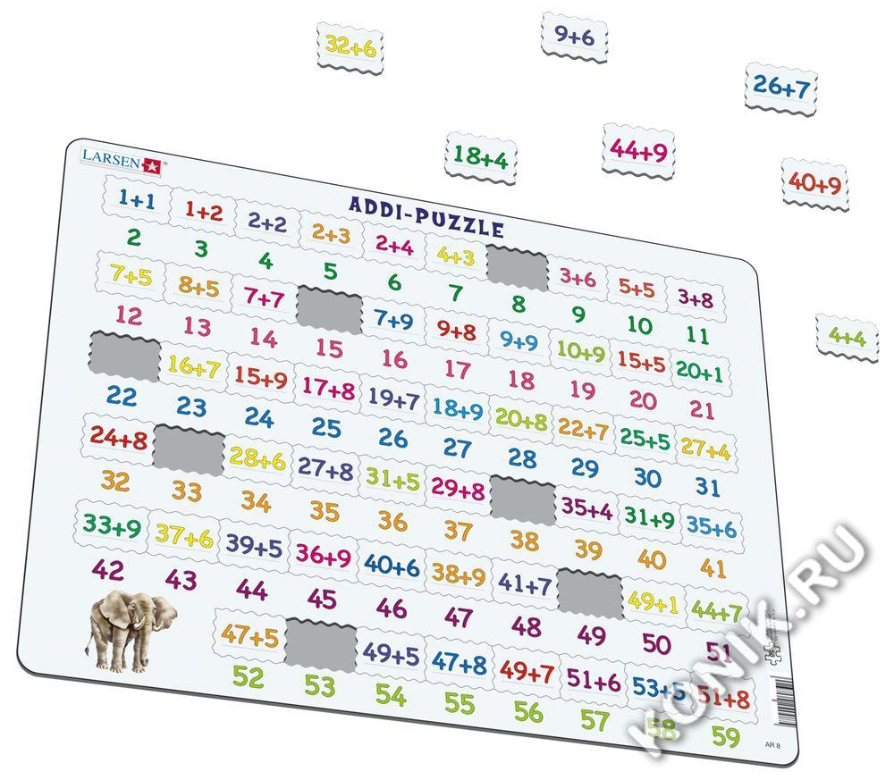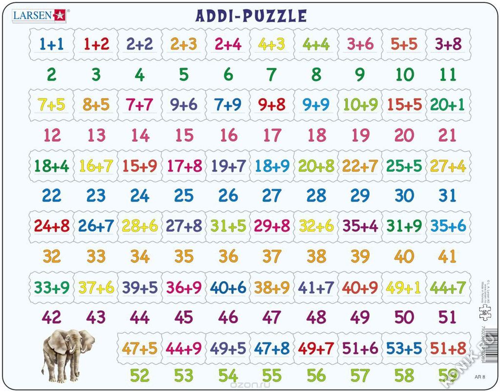 Пазлы Ларсен - это прежде всего обучающие пазлы. Пазл Сложение относится к серии Математика и знакомит детей от 4 лет с примерами сложения в игровой форме. На самом картоне напечатаны ответы, а детям ... Показать описаниенеобходимо найти соответствующий пример сложения. Многообразие форм вырубки и различные размеры отдельных элементов способствуют развитию мелкой моторики у малышей. Сделанные из высококачественного трехслойного картона, они не деформируются и легко берутся в руки. Все пазлы снабжены специальной подложкой, благодаря чему их удобно собирать. В наборе: 58 элементов пазла. Размер собранного поля - 36,5 х 28,5 см.