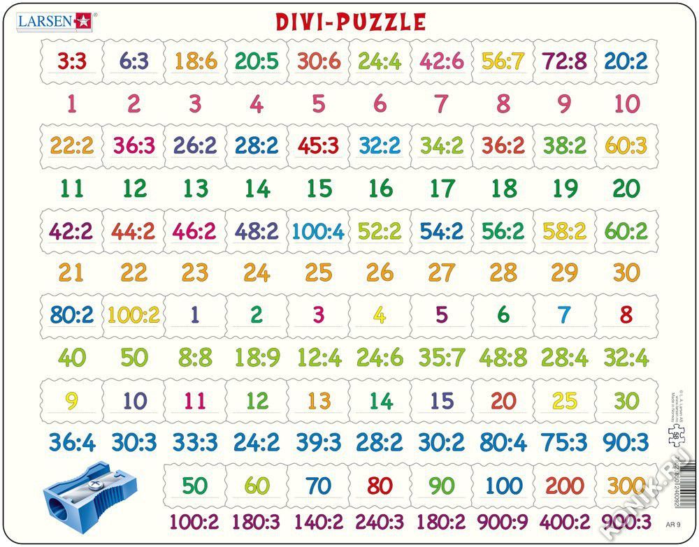 Пазлы Ларсен - это прежде всего обучающие пазлы. Пазл Деление относится к серии Математика и знакомит детей от 6 лет с примерами деления в игровой форме. На картоне напечатаны ответы, а детям необходи... Показать описаниемо найти соответствующий пример деления. Многообразие форм вырубки и различные размеры отдельных элементов способствуют развитию мелкой моторики у малышей. Сделанные из высококачественного трехслойного картона, они не деформируются и легко берутся в руки. Все пазлы снабжены специальной подложкой, благодаря чему их удобно собирать. В наборе: 58 элементов пазла. Размер собранного поля - 36,5 х 28,5 см.