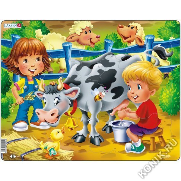 Большой красочный пазл Larsen расскажет вашему ребенку об увлекательной жизни на ферме и поможет весело провести время. На пазле изображены дети и корова, а также множество ярких деталей и персонажей,... Показать описание которые делают сборку пазла еще более увлекательным занятием. По готовому изображению можно составить развернутый рассказ с упоминанием представленных героев. Пазл Larsen выполнен из прочного многослойного картона, детали удобно брать в ручки и соединять между собой. Игровой пазл можно использовать много раз, собирая и разбирая картинку. Игра с пазлами развивает мелкую моторику рук, внимание, логическое мышление и творческое воображение. В наборе: 18 элементов пазла. Размер собранного поля - 36,5 х 28,5 см.