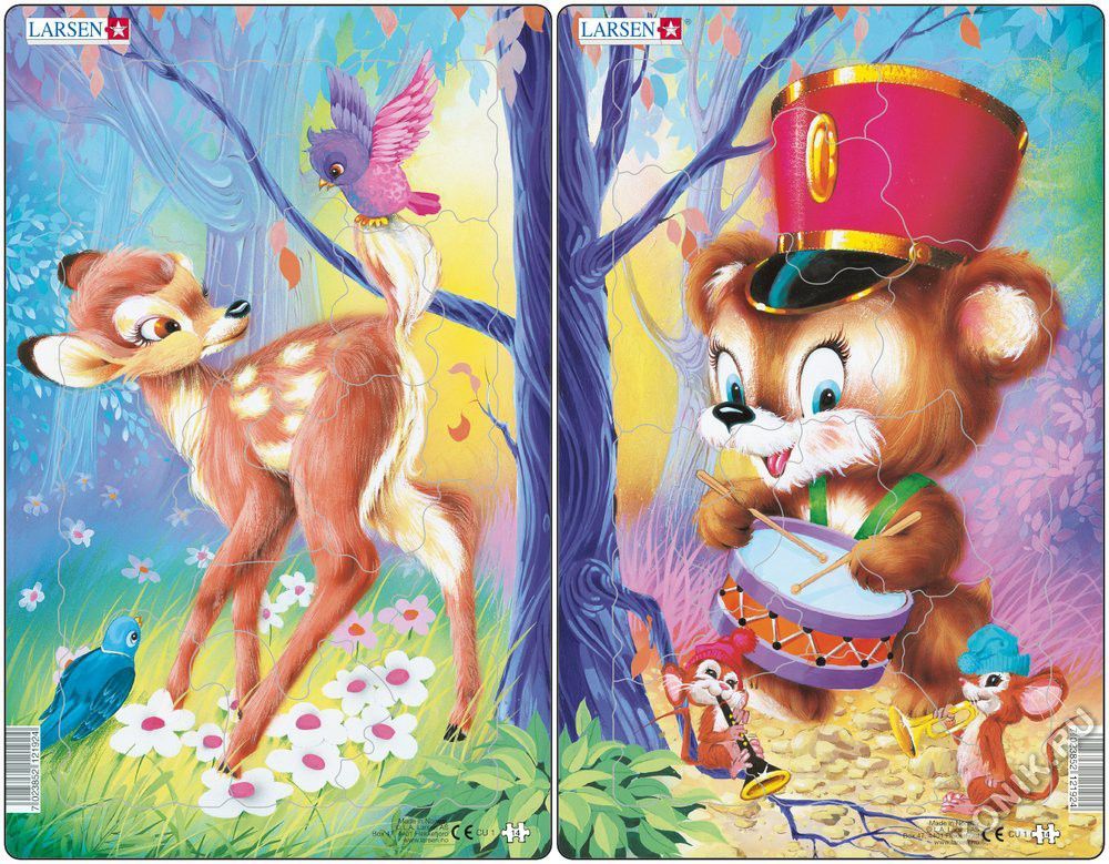 Цена указана за один пазл! Пазлы Ларсен - это прежде всего обучающие пазлы. Данные пазлы выпущены к 70-летнему юбилею компании Larsen (1947-2017). Эти позиции были одними из самых продаваемых пазлов у... Показать описание Ларсен. Выпущены впервые в 1974 году. На одной картинке изображен милый олененок с птичками, а на второй забавный медвежонок в шапочке, с барабаном и смешными мышатами, играющими на дудочках. Вашему малышу непременно понравится собирать такие чудесные картинки! Многообразие форм вырубки и различные размеры отдельных элементов способствуют развитию мелкой моторики у малышей. Сделанные из высококачественного трехслойного картона, они не деформируются и легко берутся в руки. Все пазлы снабжены специальной подложкой, благодаря чему их удобно собирать. В наборе: 14 элементов пазла. Размер собранного поля - 28,5 х 18,3 см.