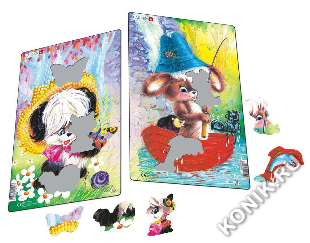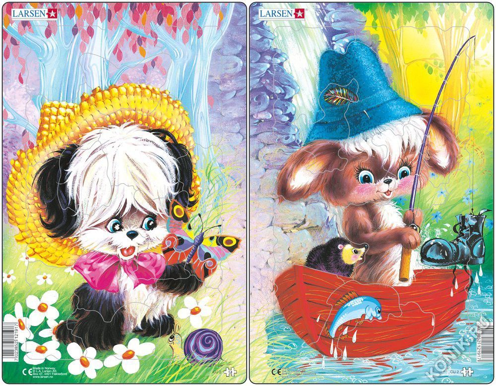Цена указана за один пазл! Пазлы Ларсен - это прежде всего обучающие пазлы. Данные пазлы выпущены к 70-летнему юбилею компании Larsen (1947-2017). Эти позиции были одними из самых продаваемых пазлов у... Показать описание Ларсен. Выпущены впервые в 1974 году. На одной картинке изображена милая собачка в шляпке и с бантиком, а на второй смешной песик на рыбалке со своим другом ёжиком. Вашему малышу непременно понравится собирать такие чудесные картинки! Многообразие форм вырубки и различные размеры отдельных элементов способствуют развитию мелкой моторики у малышей. Сделанные из высококачественного трехслойного картона, они не деформируются и легко берутся в руки. Все пазлы снабжены специальной подложкой, благодаря чему их удобно собирать. В наборе: 14 элементов пазла. Размер собранного поля - 28,5 х 18,3 см.