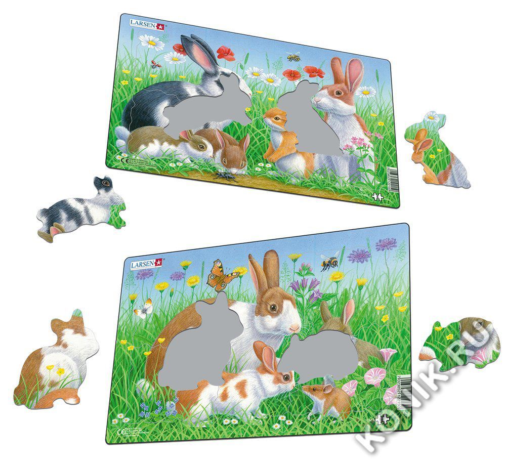 Цена указана за один пазл! Пазлы Ларсен - это прежде всего обучающие пазлы. Данная серия знакомит ребенка с милыми кроликами. На картинке одного пазла изображено семейство кроликов: мама, папа и три м... Показать описаниеилых малыша-кролика. Маленькие кролики с любопытством рассматривают жука на полянке. Другой пазл изображает маму-крольчиху и её двух малышей, а также забавную полевую мышку, которая пришла познакомиться с кроликами. Среди деталей пазла имеются две детали в форме кроликов. Многообразие форм вырубки и различные размеры отдельных элементов способствуют развитию мелкой моторики у малышей. Сделанные из высококачественного трехслойного картона, они не деформируются и легко берутся в руки. Все пазлы снабжены специальной подложкой, благодаря чему их удобно собирать. В наборе: 8 элементов пазла. Размер собранного поля - 28,5 х 18,3 см.