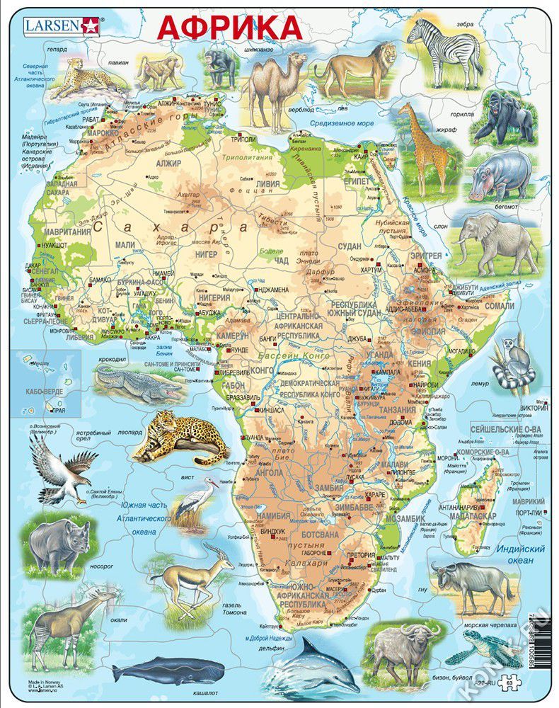Красочный пазл норвежской фирмы Ларсен поможет ребенку интересно провести время и изучить страны, животных и очертания африканского континента. Русифицированный пазл состоит из большого количества эле... Показать описаниементов, на которые нанесены надписи крупных городов и изображения животных, рельефа, прибрежной территории. Пазл Ларсен Африка станет прекрасным дидактическим пособием на уроках географии и естествознания, поможет детям с большим увлечением заниматься дома дополнительными уроками в интересной форме. В наборе: 63 элемента пазла. Размер собранного поля - 36,5 х 28,5 см.