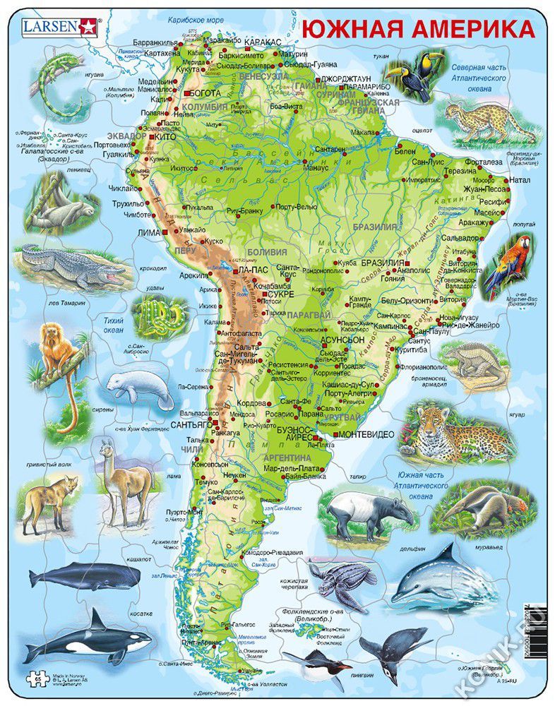 С помощью красочного пазла ребенок сможет познакомиться с теплыми странами Южной Америки и ее обитателями. На деталях пазла изображен рельеф, нанесены надписи крупных городов и рек, яркие реалистичные... Показать описание изображения птиц и животных дадут полное представление о флоре и фауне материка. Пазл Ларсен Африка станет прекрасным дидактическим пособием на уроках географии и естествознания, поможет детям с большим увлечением заниматься дома дополнительными уроками в интересной форме. В наборе: 65 элементов пазла. Размер собранного поля - 36,5 х 28,5 см. Пазл Южная Америка русифицирован. Пазл Ларсен выполнен из плотного трехслойного картона, детали легко и прочно соединяются друг с другом, образуя единое красочное поле.