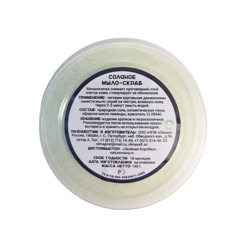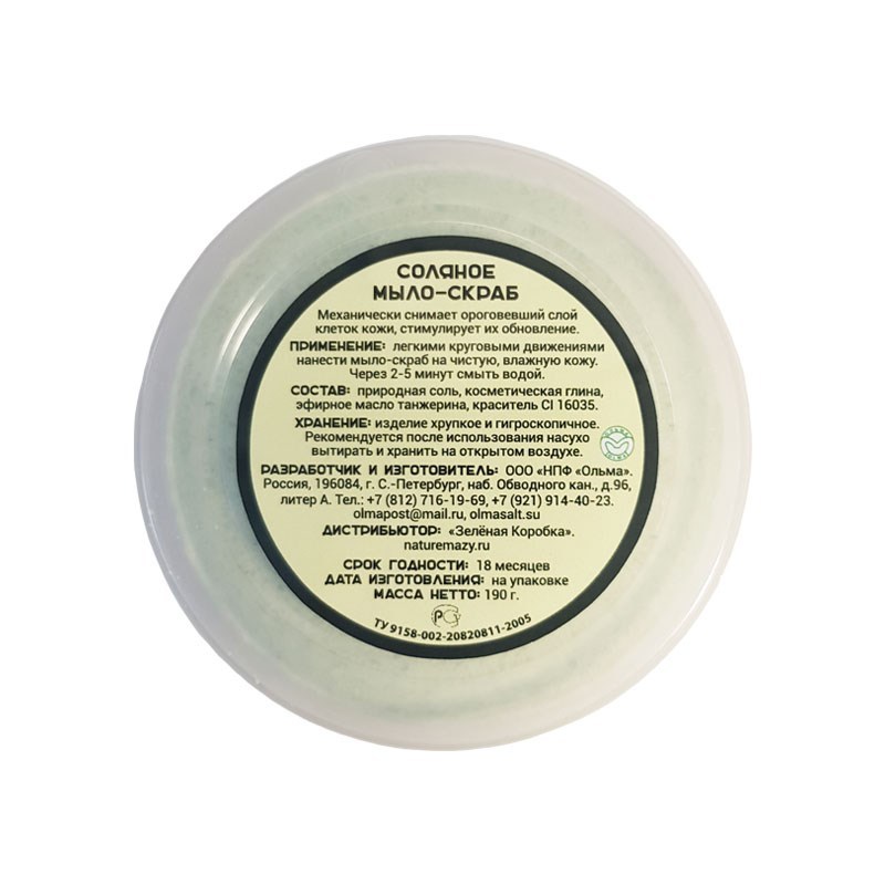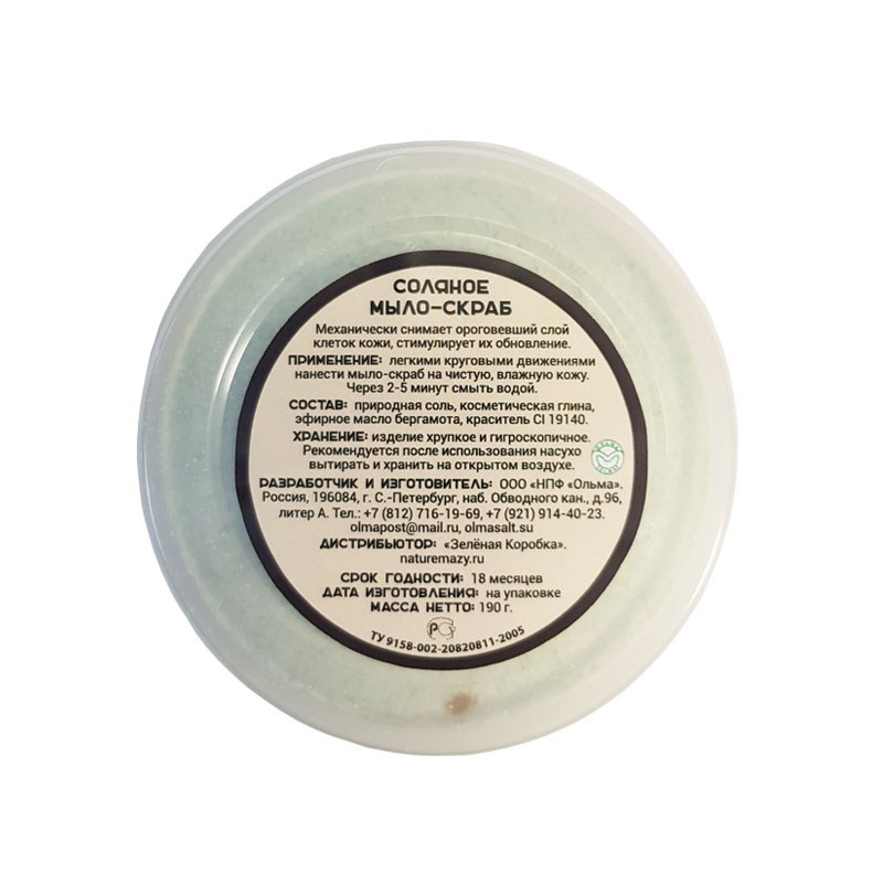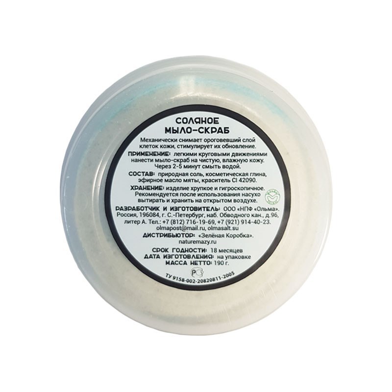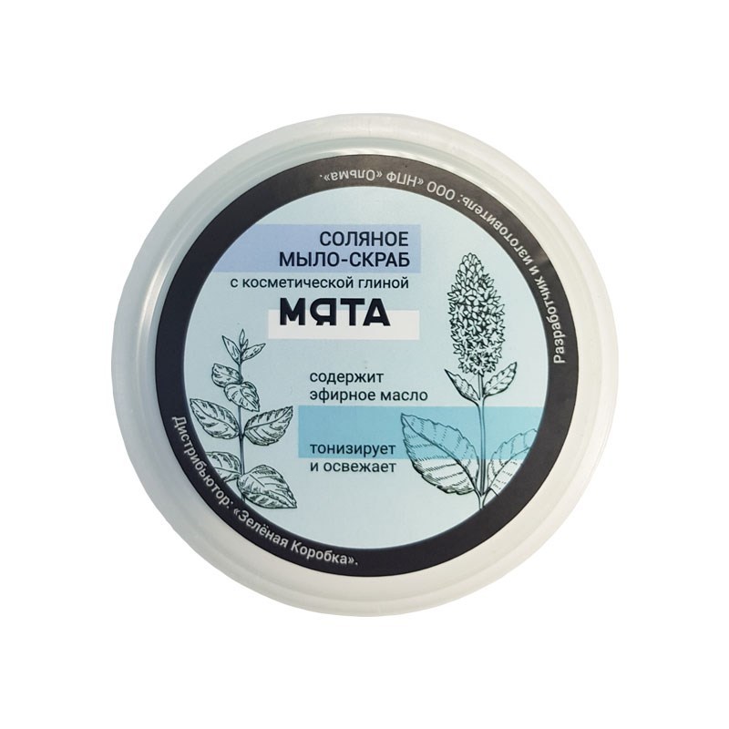 С косметической глиной. Мыло-скраб содержит эфирное масло Мяты. Используется для тонизирующих, оздоровительных и косметических процедур. Придает упругость и бархатистость коже, нормализует кровоток в ... Показать описаниекожных покровах и обмен веществ. Действует как скраб, механически снимая верхний слой ороговевших и омертвевших клеток, воздействует своим соляным составом с добавками на молодые клетки кожи, укрепляя и питая их. Выводит шлаки из организма, стимулирует обновление клеток кожи, способствует расщеплению жировых отложений. СОСТАВ: природная соль, косметическая глина, эфирное масло мяты, краситель CI 42090 ВЕС: 190 грамм ПРОТИВОПОКАЗАНИЯ: Индивидуальная непереносимость компонентов. СПОСОБ ПРИМЕНЕНИЯ: Чистую влажную поверхность кожи натирают легкими круговыми движениями соляным мылом и через 2-5 минут ополаскивают водой. УСЛОВИЯ ХРАНЕНИЯ: После использования рекомендуется насухо вытирать и хранить на открытом воздухе. СРОК ГОДНОСТИ: 18 мес.