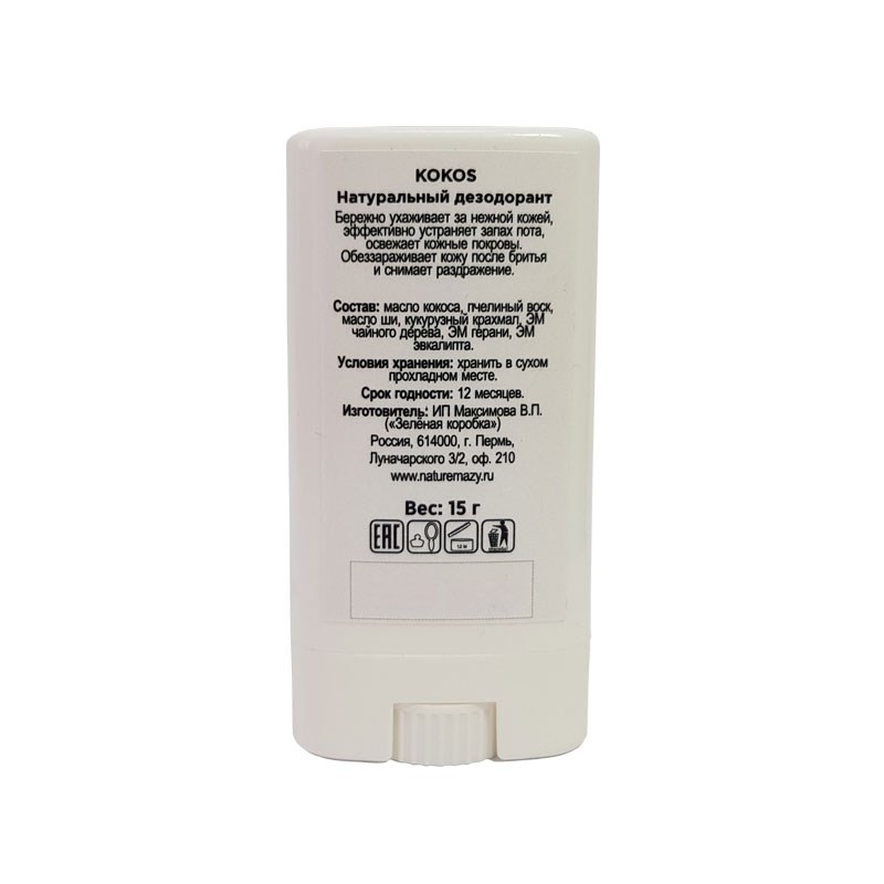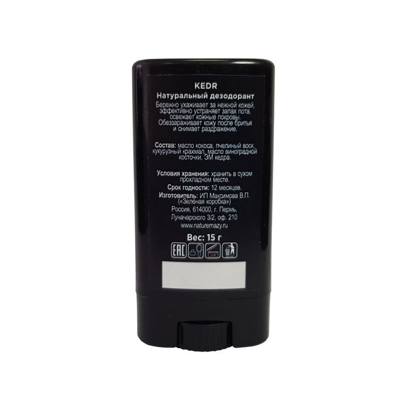 БЕЗОПАСНАЯ ЗАЩИТА ОТ ЗАПАХА ПОТА Наше производство. 100% натуральный продукт! Восковой дезодорант – натуральное и безопасное средство по уходу за телом. Он не только эффективно устраняет запах пота, н... Показать описаниео и бережно ухаживает за нежной кожей, позволяя ей очищаться естественным путем. Обеззараживает кожу после бритья и снимает раздражение. НЕ СОДЕРЖИТ солей алюминия, стабилизаторов и консервантов. ПОДХОДИТ для применения людям с самой чувствительной кожей. СОСТАВ: масло кокоса, пчелиный воск, масло ши, кукурузный крахмал, масло виноградной косточки, эфирное масло кедра. + кокосовое масло обладает легким антибактериальным эффектом, выполняет защитные функции и надолго поддерживает оптимальный баланс влажности в коже. + пчелиный воск отлично снимает воспаления, увлажняет, смягчает кожу. Медленно впитываясь в кожу и закрывая ее защитной пленкой, он не блокирует поры. + масло ши проявляет антисептическое, противовоспалительное, регенерирующее, защитное действие, помогает восстановить естественную эластичность кожи. + кукурузный крахмал является абсорбентом, защищает и подсушивает кожу + масло виноградной косточки быстро впитывается в коже, не оставляя следов. Регулирует секрецию сальных желез, уменьшает потоотделение + эфирное масло кедра обладает дезодорирующим эффектом ВЕС: 15 грамм ПРОТИВОПОКАЗАНИЯ: Индивидуальная непереносимость компонентов. СПОСОБ ПРИМЕНЕНИЯ: Нанести дезодорант на чистую сухую кожу в области подмышек и подождать до полного впитывания. УСЛОВИЯ ХРАНЕНИЯ: Хранить в сухом прохладном месте. СРОК ГОДНОСТИ: 12 мес.