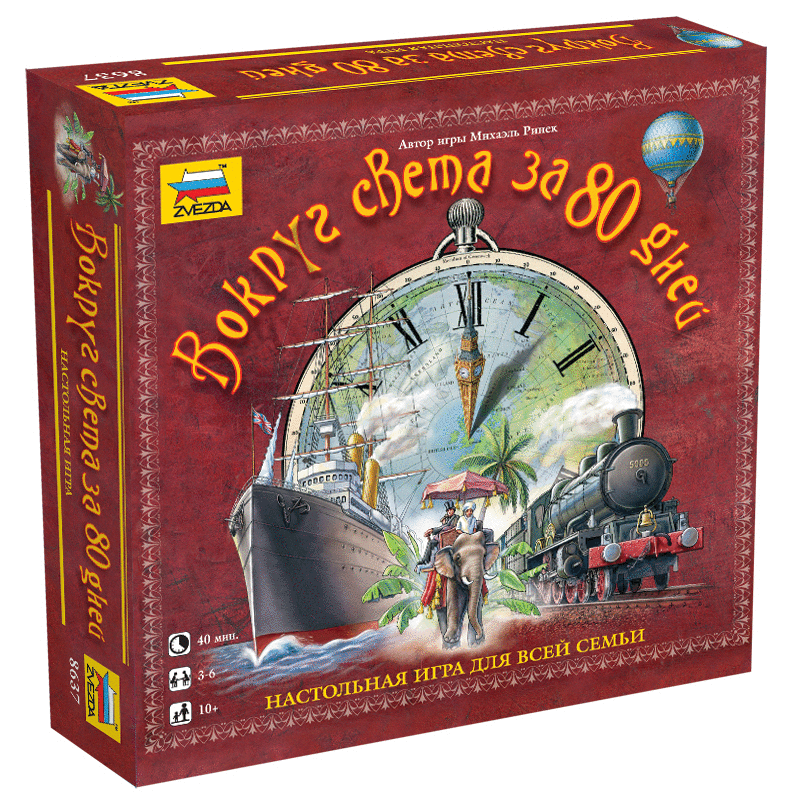Очень интересная и увлекательная настольная игра по одноименному произведению Жюля Верна. Нестареющий сюжет, интересный дизайн. Игрокам предстоит совершить кругосветное путешествие из Лондона за 80 дн... Показать описаниеей (в игре – 80 ходов). Для этого у них в распоряжении железные дороги и корабли. Игроки набирают карточки действий и исходя из них применяют различные маршруты. Побеждает тот, кто лучше всего распланирует свое путешествие. Состав игры: - Игровое поле - Игровые карточки – 75 шт. - Игровые жетоны – 49 шт. - Фишки героев – 13 шт. - Правила игры