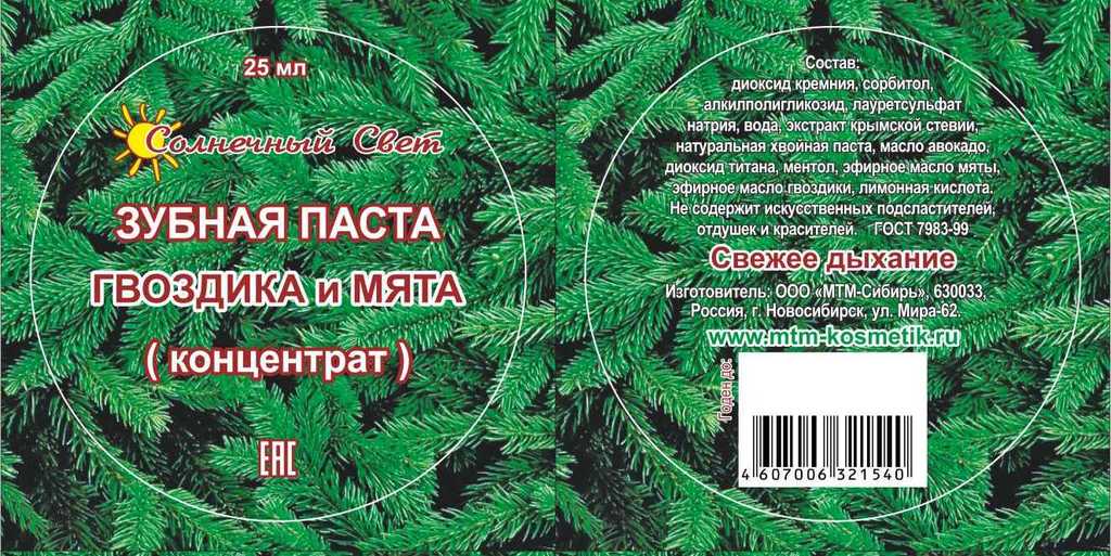 Эфирное масло гвоздики считается самым сильным натуральным средством подавления микроорганизмов, являющихся причиной кариеса и периодонтальных заболеваний, Гвоздика используется как средство для обезб... Показать описаниеоливания — местный анестетик, обладает противовоспалительными свойствами, дезинфицирует полость рта. В прошлом гвоздика, благодаря своим бактерицидным свойствам, использовалась стоматологами для дезинфекции корневых каналов. Эфирное масло мяты — чрезвычайно эффективное средство против анаэробных бактерий, существующих в среде с низким содержанием кислорода (например, в ротовой полости), и способных вызывать заболевания дёсен. Устраняя микробы, эфирное масло заживляет язвочки и ранки, снимает воспалительные процессы и успокаивает ткани дёсен, восстанавливает свежесть дыхания Натуральная хвойная паста оказывает антибактериальное, противогрибковое и противовирусное действие, способствует заживлению ранок и язвочек во рту, снижает болезненность и кровоточивость десен, обладает дезодорирующим эффектом – уменьшает неприятные запахи. Не содержит искусственных подсластителей, отдушек и красителей. Способ применения: нанести на зубную щетку небольшое количество концентрата, объемом не более, чем горошина. Использовать для чистки зубов и полости рта, как обычную зубную пасту. На протяжении последних десятилетий все большую и большую важность приобретает правильный уход за зубами. Это связано с как осознанием роли профилактических мероприятий для борьбы с заболеваниями в полости рта, так и с интенсивной научно-технической деятельностью в области стоматологии и личной гигиены. Использование диоксида кремния при производстве зубных паст является одной из характеристик научно-технического прогресса в области гигиены ротовой полости. Диоксид кремния используется в качестве высокоэффективного абразивного материала ( для механической чистки зубов ), при щадящем воздействии на зубную эмаль, в отличие от применяемого в популярных тайских зубных пастах мела ( карбоната кальция ) — агрессивно «стирающего» эмаль зубов. Являясь химически инертным веществом, высокочистый диоксид кремния не вступает в химическое взаимодействие с остальными компонентами рецептуры и не является питательным веществом для бактерий и микроорганизмов. Диоксид кремния является природным веществом. Существует в натуральном виде в форме кварца, то есть минерала, который составляет песок. В пищевой промышленности применяется вещество, которые искусственно синтезировано, с высокой степенью чистоты (аморфный диоксид кремния). Его получают посредством нагревания кремния в кислородной атмосфере. Влияние на организм человека: диоксид кремния проходит через желудочно-кишечный тракт человека в неизмененном состоянии, полностью выводится из организма. Экстракт крымской стевии – натуральный сахарозаменитель, природный консервант, обладающий противогрибковой и антимикробной функциями. является полностью природной стимуляцией секреции инсулина и обладает гипогликемизирующим действием. В ряде стран употребление стевии официально является одним из средств терапии диабета, часто используется в качестве вспомогательного вещества в процессе борьбы с ожирением. Экстракт стевии содержат комплекс минеральных элементо