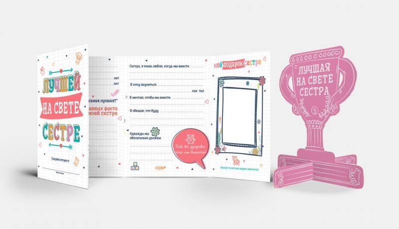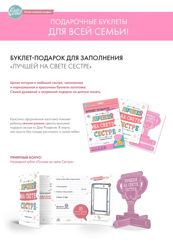 Целая история о любимой сестре, написанная и нарисованная ребенком – какой подарок может быть лучше?! Эта мини-история о сестре станет очень душевным подарком со смыслом, сохранив ее на долгие годы в ... Показать описаниесемейном альбоме, через много лет Вам будет безумно интересно прочитать ее вновь. Внутри красочно оформленный буклет–заготовка для ребенка, чтобы красиво и своими руками поздравить сестру с Днем Рождения, 8 марта, или просто без повода рассказать о своей любви. Приятный бонус: Наградной кубок "Лучшая на свете Сестра", чтобы сестра гордо поставила у себя! Cute'n Clever - начало семейной истории!