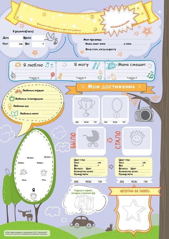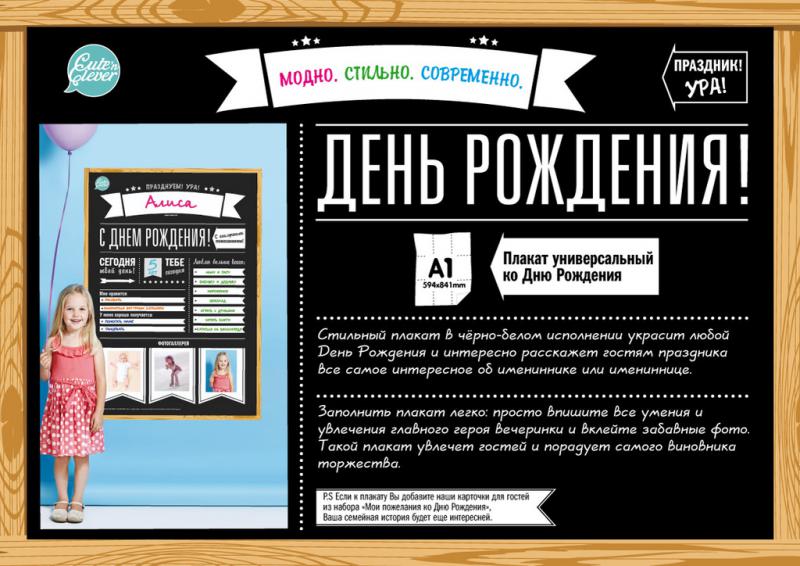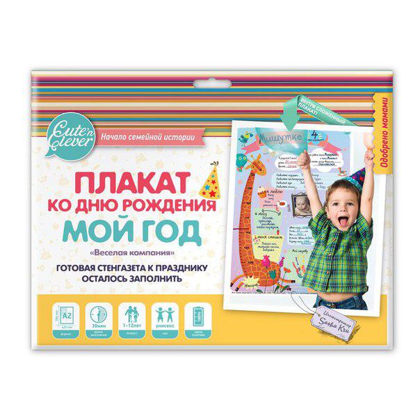 У Вашего ребенка скоро День Рождения? Хочется чего-то оригинального? В помощь занятым и креативным мамам (и папам), мы предлагаем этот замечательный плакат формата А2 МОЙ ГОД проиллюстрированный худож... Показать описаниеником, который расскажет родным и близким о всех новостях именинника или именинницы за прошедший год. Вам нужно просто заполнить плакат, вписать все умения и увлечения главного героя праздника, вклеить фото Было и Стало, а также фото главных достижений. Вы можете делать на плакате зарисовки, коллажи и все, что вам позволит Ваша фантазия. Этот плакат украсит любой праздник и наглядно расскажет гостям о самом важном из жизни именнинника или именинницы. Cute'n Clever - начало семейной истории!